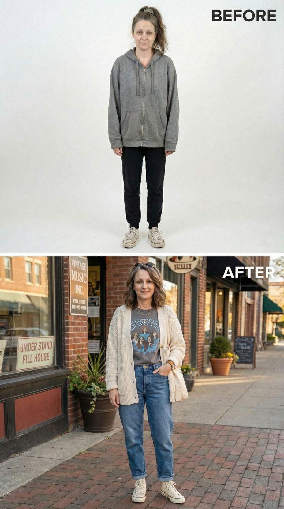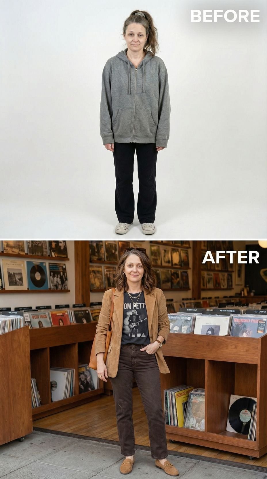 Swap that oversized gray hoodie for a structured tan blazer that instantly elevates your entire vibe. The Tom Petty graphic tee adds authentic rock credibility while perfectly fitted dark jeans create a sleek silhouette. Brown leather loafers ground the look with vintage appeal. This transformation proves that moving from Tired Suburban 44 year old woman comfort wear to rock goddess style requires just three key pieces and serious attitude.