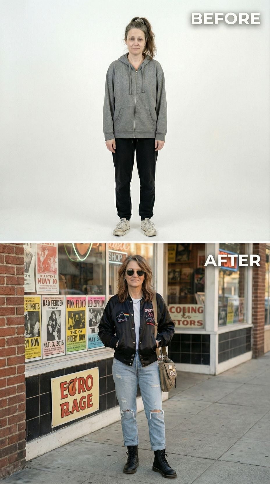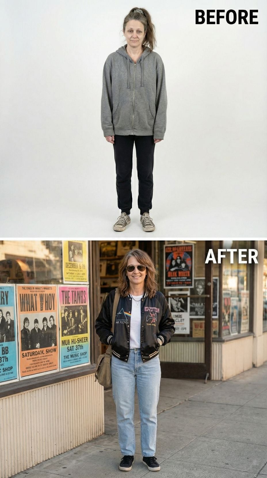 Dark bomber jackets paired with vintage band tees create instant rock star credibility. The transformation from tired suburban 44 year old woman to edgy music lover happens through strategic layering and authentic vintage pieces. High-waisted jeans ground the look while aviator sunglasses add mysterious appeal. Record store backdrops complete this effortlessly cool aesthetic that channels serious music devotee vibes.