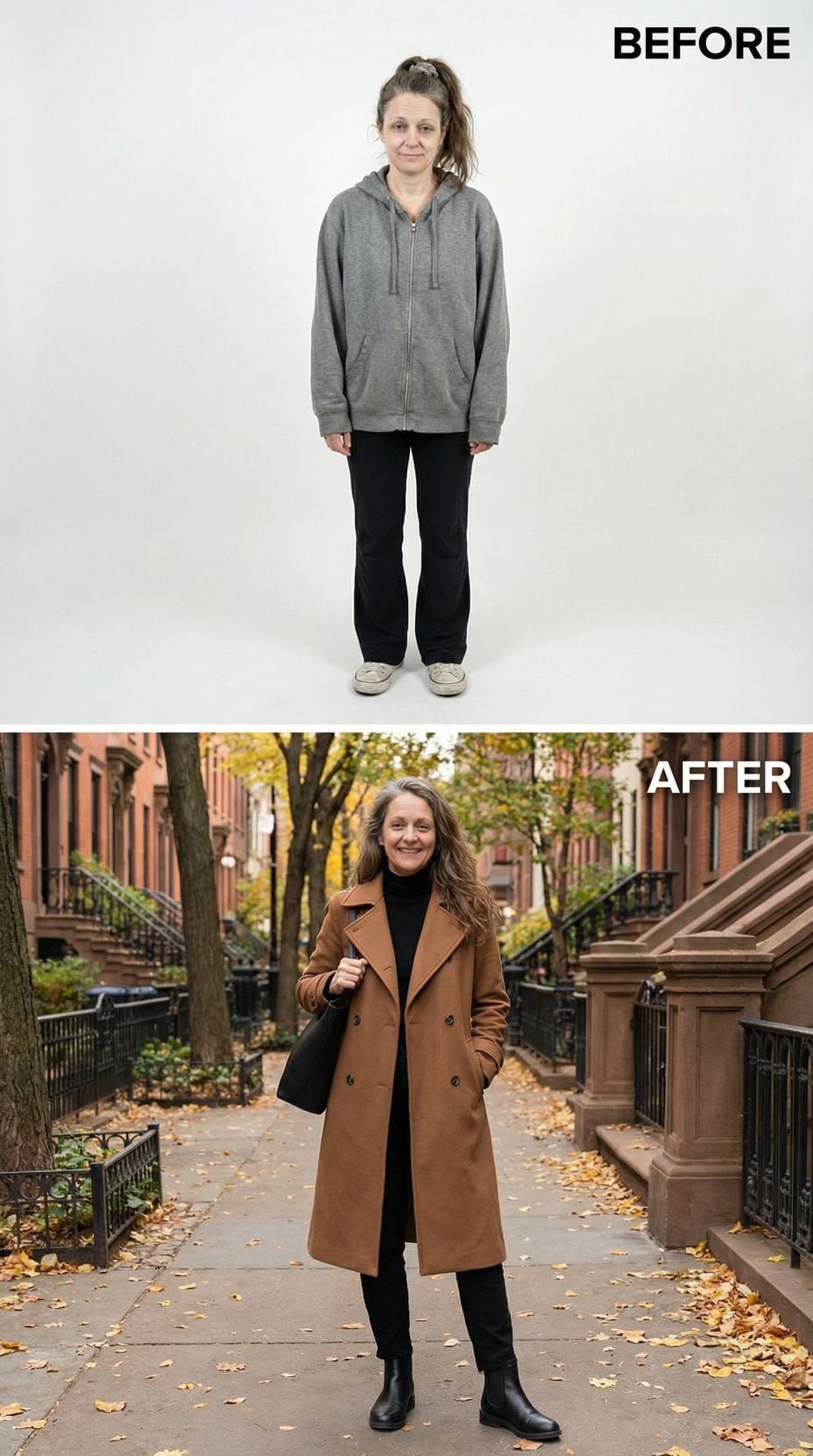 Camel wool coats instantly elevate any wardrobe from frumpy to fabulous. The transformation from Tired Suburban 44 year old woman becomes complete when you swap oversized hoodies for tailored outerwear. Black skinny jeans and ankle boots create a sleek foundation, while the double-breasted silhouette adds structure and polish. Long, flowing hair and confident posture seal this metropolitan makeover perfectly.