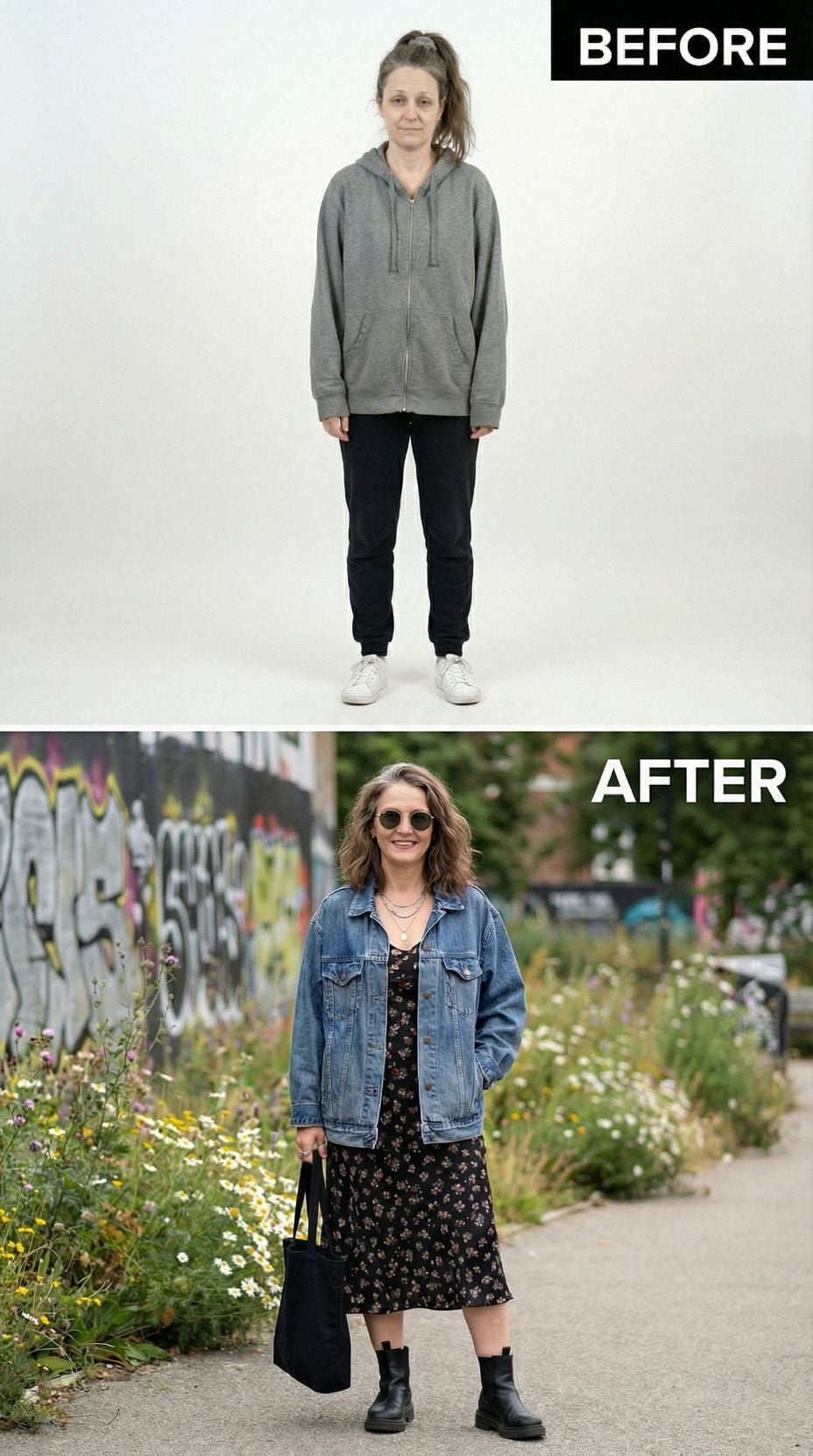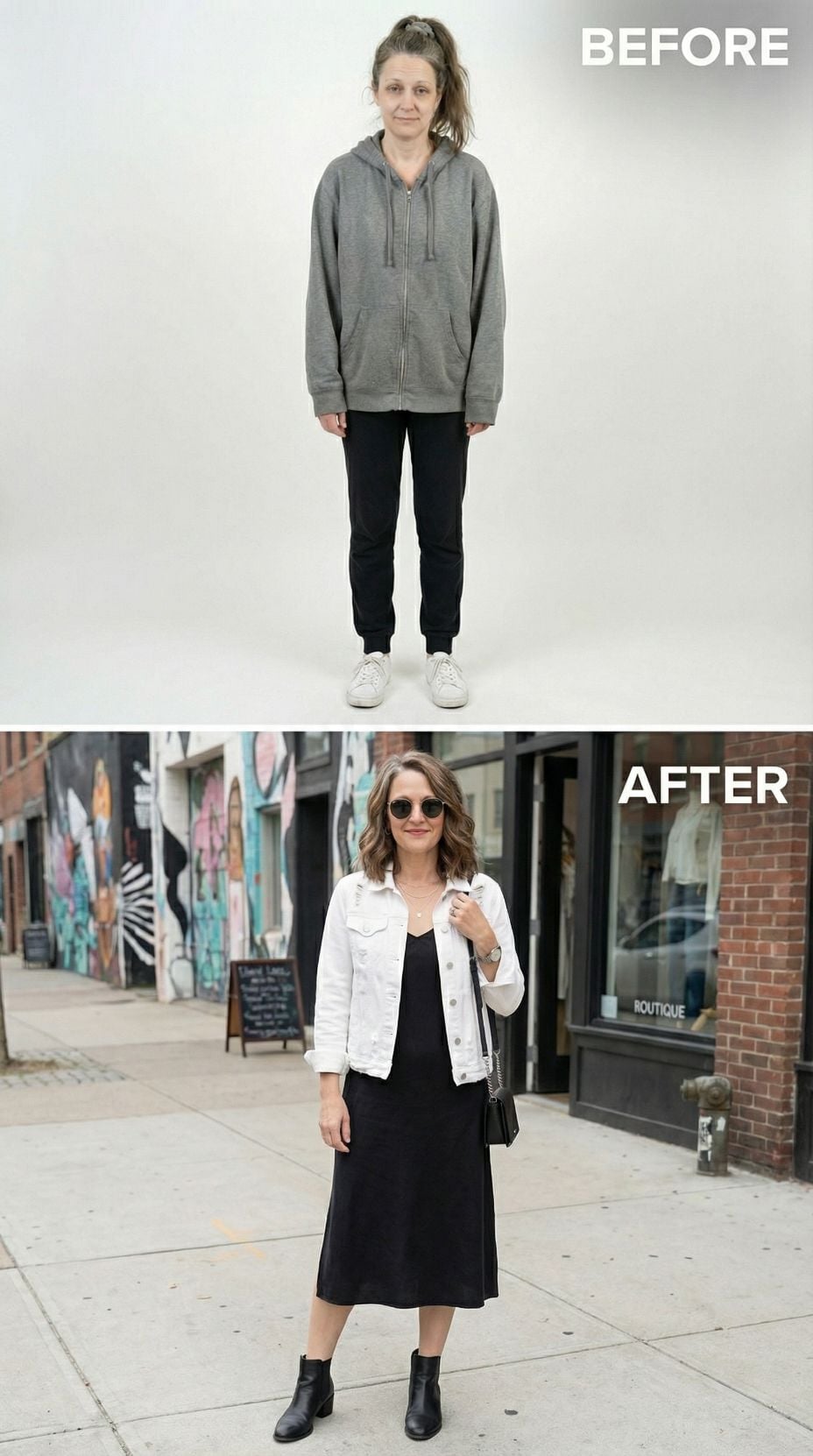 White denim jackets instantly elevate any casual look from frumpy to fabulous. The transformation shows how swapping oversized gray hoodies for structured outerwear creates definition and sophistication. Black midi dresses provide the perfect foundation, while ankle boots add edge. Sunglasses and a crossbody bag complete this rock-and-roll inspired ensemble that takes you from tired suburban 44 year old woman to confident street style maven.