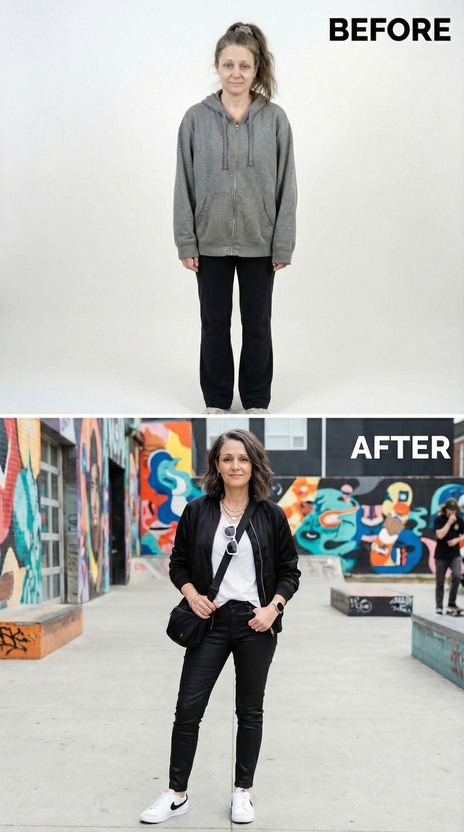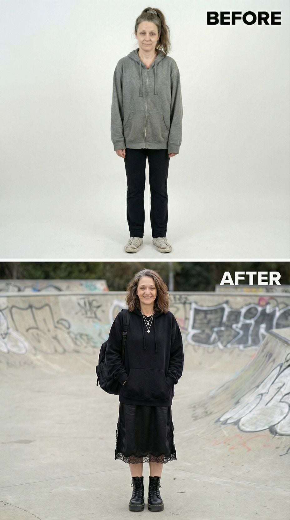 Tired Suburban 44 year old woman to Edgy Skate Park Princess