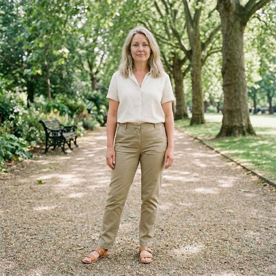 Standing in a park in sand-colored chinos and a cream button-front shirt, she looks composed but contained. The palette reads neutral on neutral, and the straight-leg trouser keeps everything pressed and polished without much personality. It is the kind of outfit that disappears into itself.