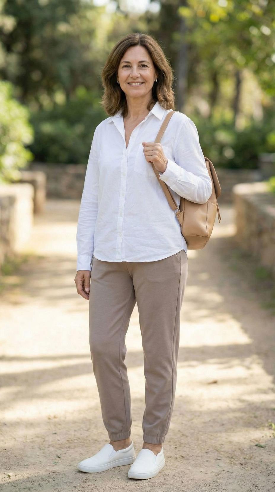 This timeless combination proves that sophistication doesn’t require complexity. The crisp white button-down shirt is styled with relaxed taupe joggers and clean white sneakers, creating a perfect balance between polished and comfortable. This look is ideal for weekend errands, casual lunch dates, or any occasion where you want to look put-together without feeling overdressed. The neutral color palette is universally flattering and creates a fresh, modern aesthetic that works beautifully for women in their late 40s who want to look effortlessly chic.