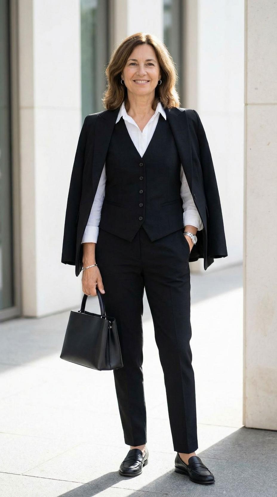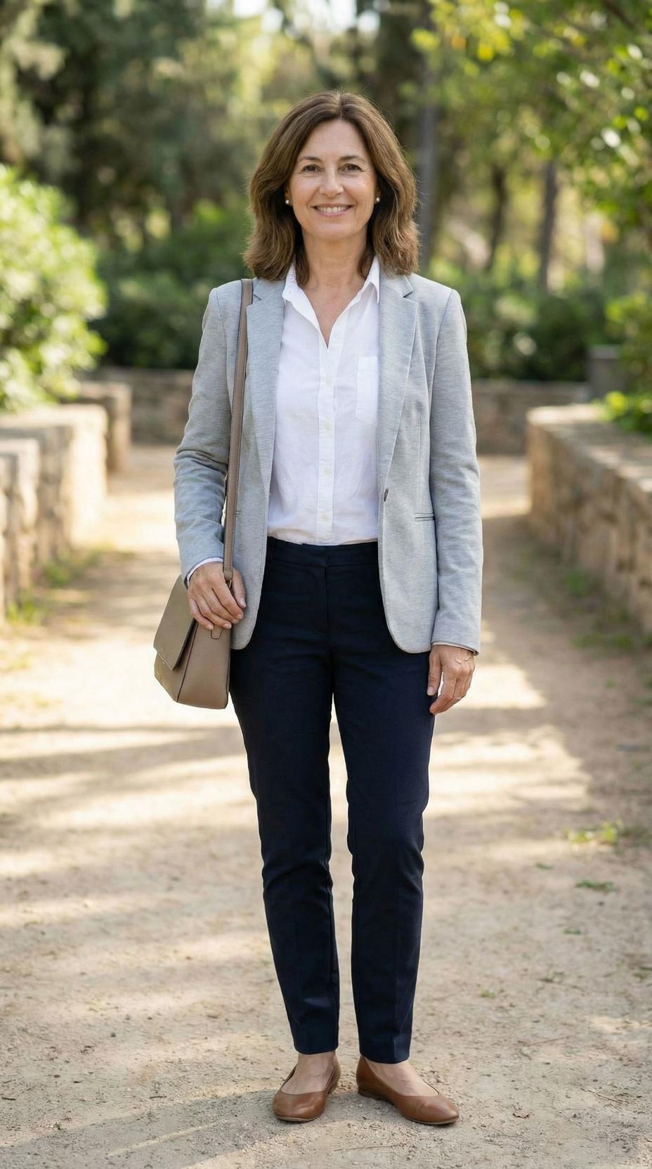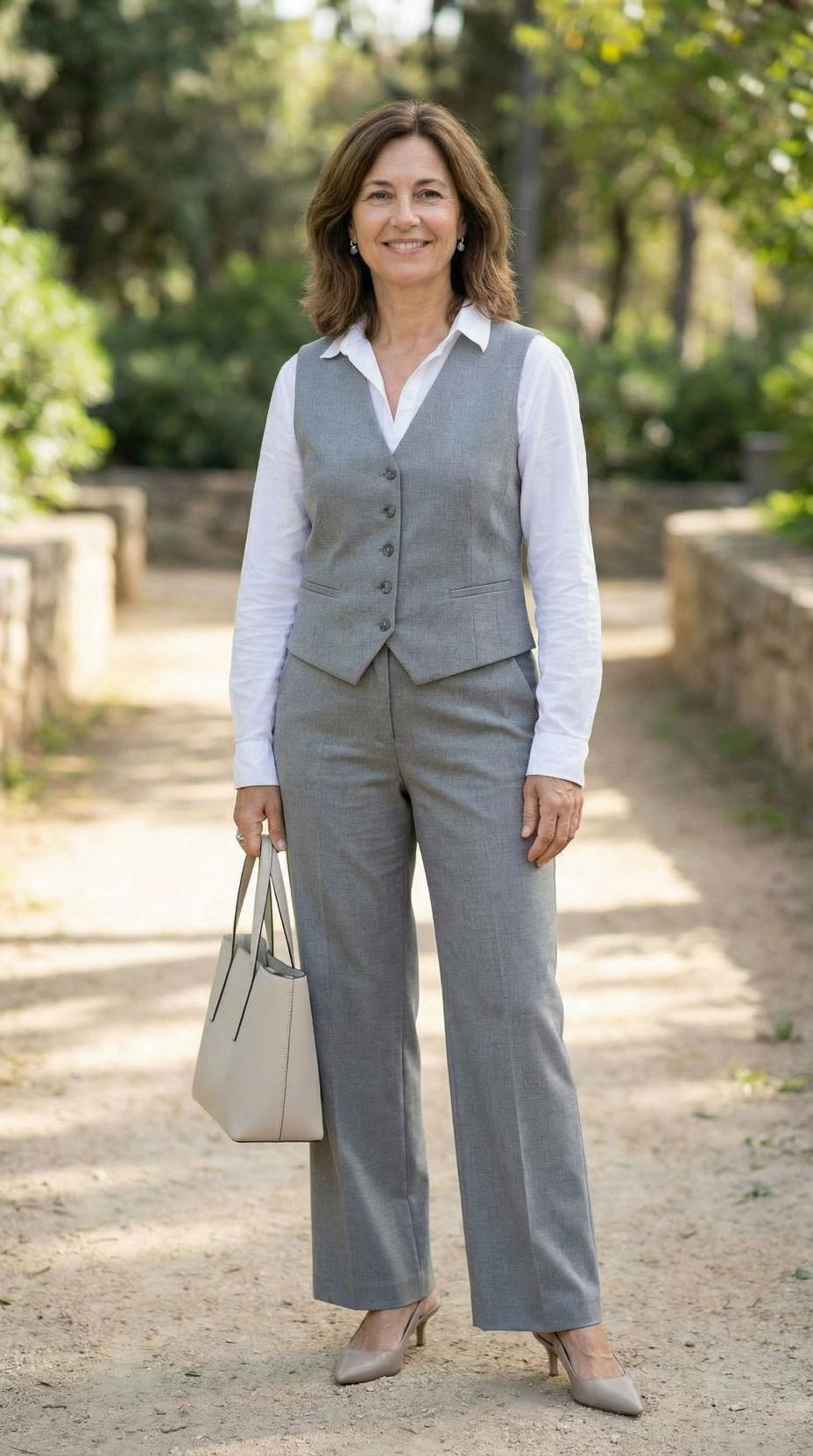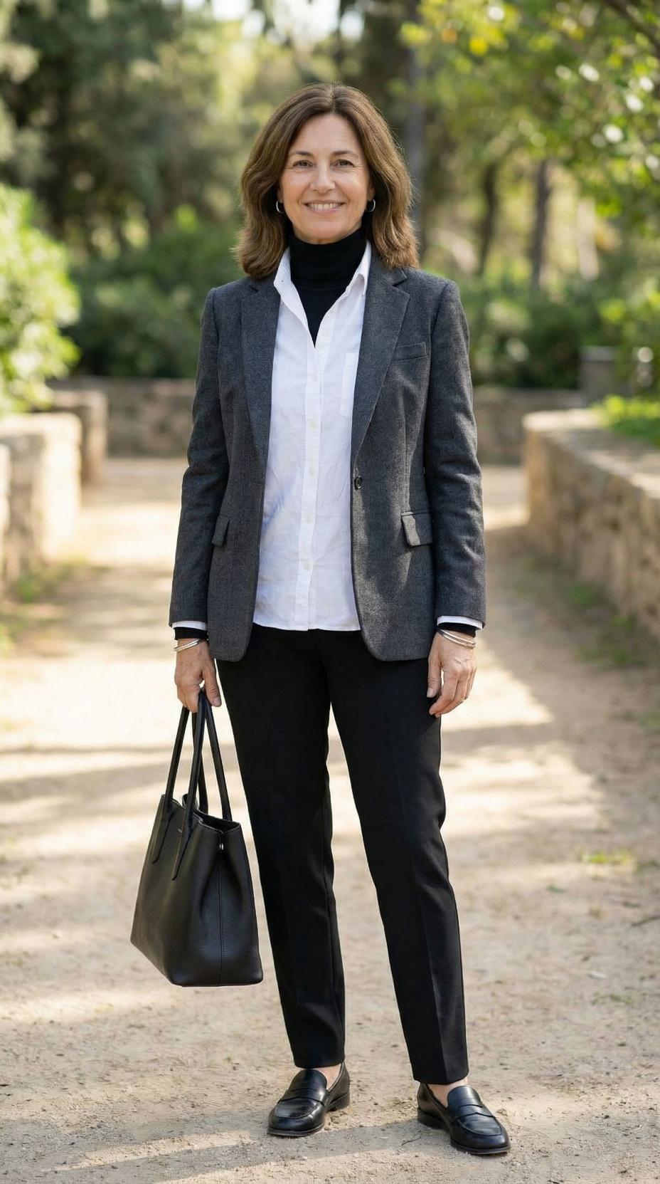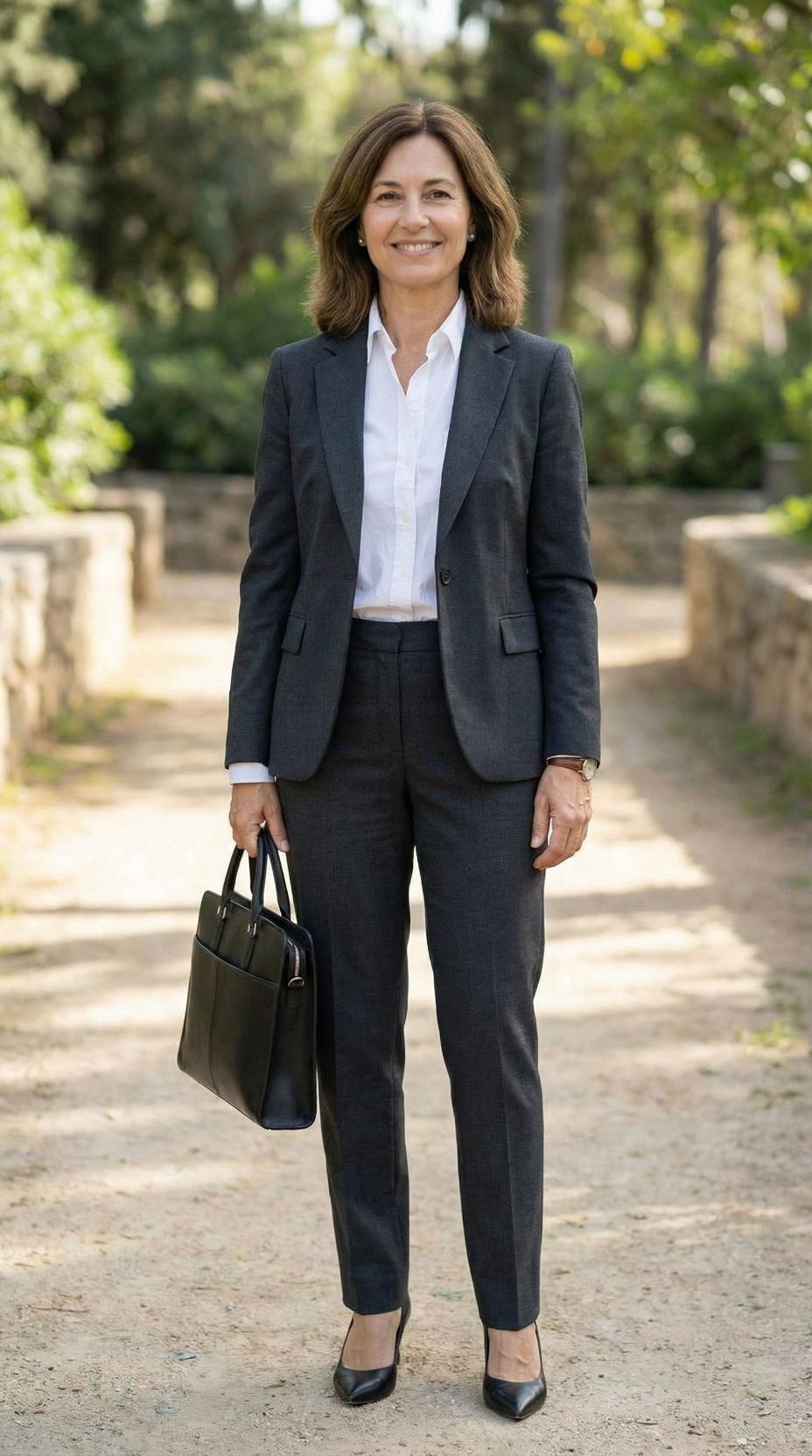 This timeless ensemble proves that classic never goes out of style for the sophisticated 48-year-old woman. The crisp white button-up serves as the perfect foundation for this elegant charcoal gray suit, creating a polished look that transitions seamlessly from boardroom meetings to business lunches. The tailored blazer and matching trousers offer a refined silhouette that’s both authoritative and feminine, while the structured black handbag adds a practical yet chic finishing touch. This outfit demonstrates how a well-fitted white shirt can anchor a professional wardrobe, offering versatility and sophistication that speaks to the modern woman’s need for both style and substance in her daily attire.