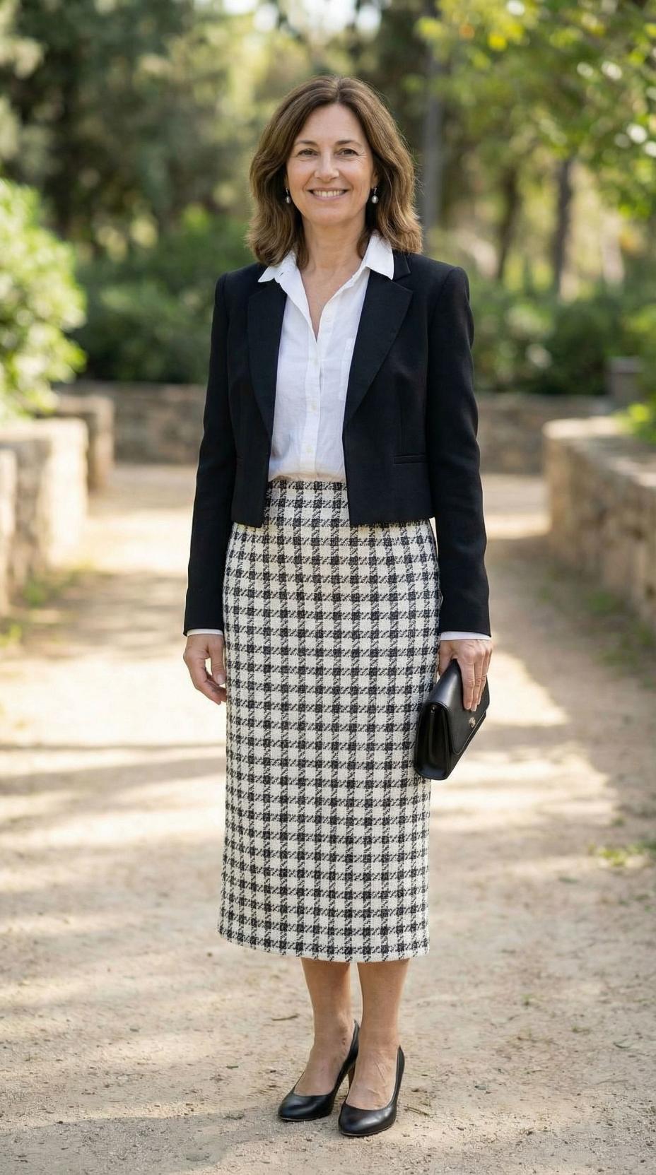 This timeless ensemble perfectly demonstrates how a crisp white button-down can anchor a polished, professional look. The classic shirt is beautifully complemented by a striking houndstooth pencil skirt that adds visual interest while maintaining workplace appropriateness. The tailored black blazer creates a sophisticated silhouette, while the monochromatic color palette ensures the outfit feels cohesive and refined. This combination works beautifully for business meetings, office presentations, or any occasion where you want to project confidence and professionalism. The key to mastering this look is in the proportions – the fitted skirt balances the structured blazer, while the crisp white shirt provides a fresh contrast to the darker elements.