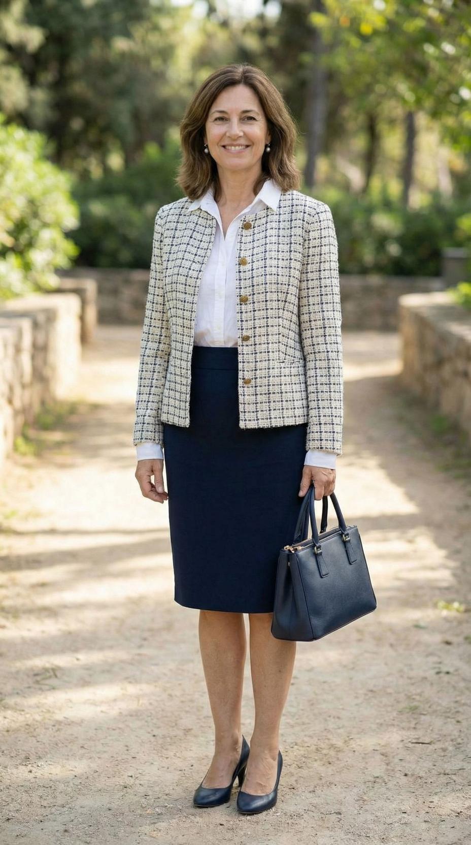 This polished ensemble demonstrates the perfect way to elevate a crisp white button-up shirt for professional settings. The look combines classic tailoring with modern sophistication – featuring a structured tweed blazer over a pristine white shirt, paired with a sleek navy pencil skirt. The monochromatic navy accessories, including pointed-toe pumps and a structured handbag, create a cohesive and refined appearance. This outfit strikes the ideal balance between authoritative and approachable, making it perfect for business meetings, networking events, or any occasion where you want to project confidence and professionalism. The neutral color palette ensures versatility while the quality pieces create a timeless look that transcends seasonal trends.