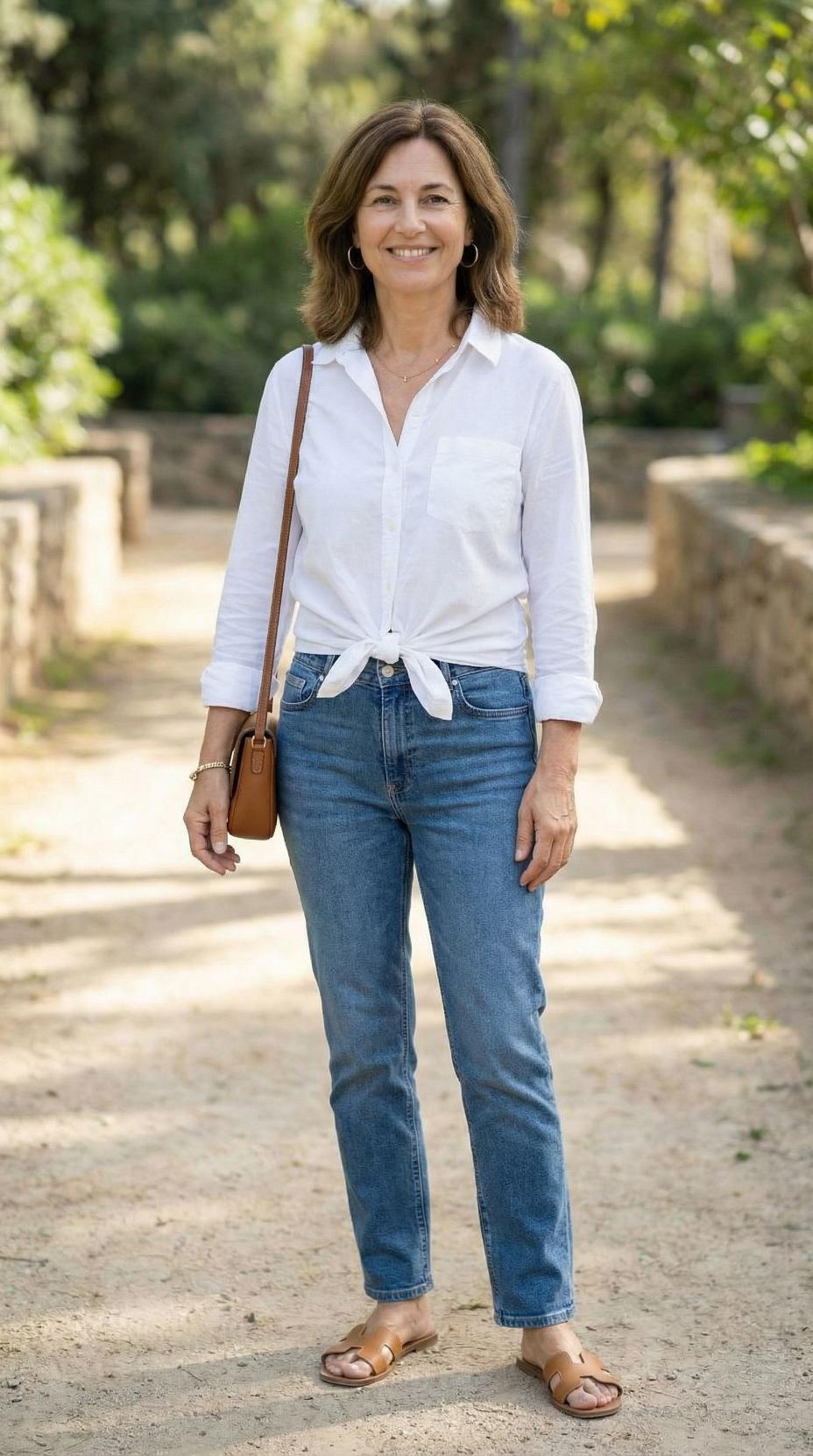 This timeless combination proves that simplicity never goes out of style. The crisp white button-down is styled with a front tie detail that adds feminine flair while creating a flattering silhouette. Paired with perfectly fitted straight-leg jeans and casual sandals, this look strikes the ideal balance between polished and relaxed. The small crossbody bag adds a practical yet chic finishing touch. This outfit is perfect for weekend brunches, casual work environments, or running errands while looking effortlessly put-together.