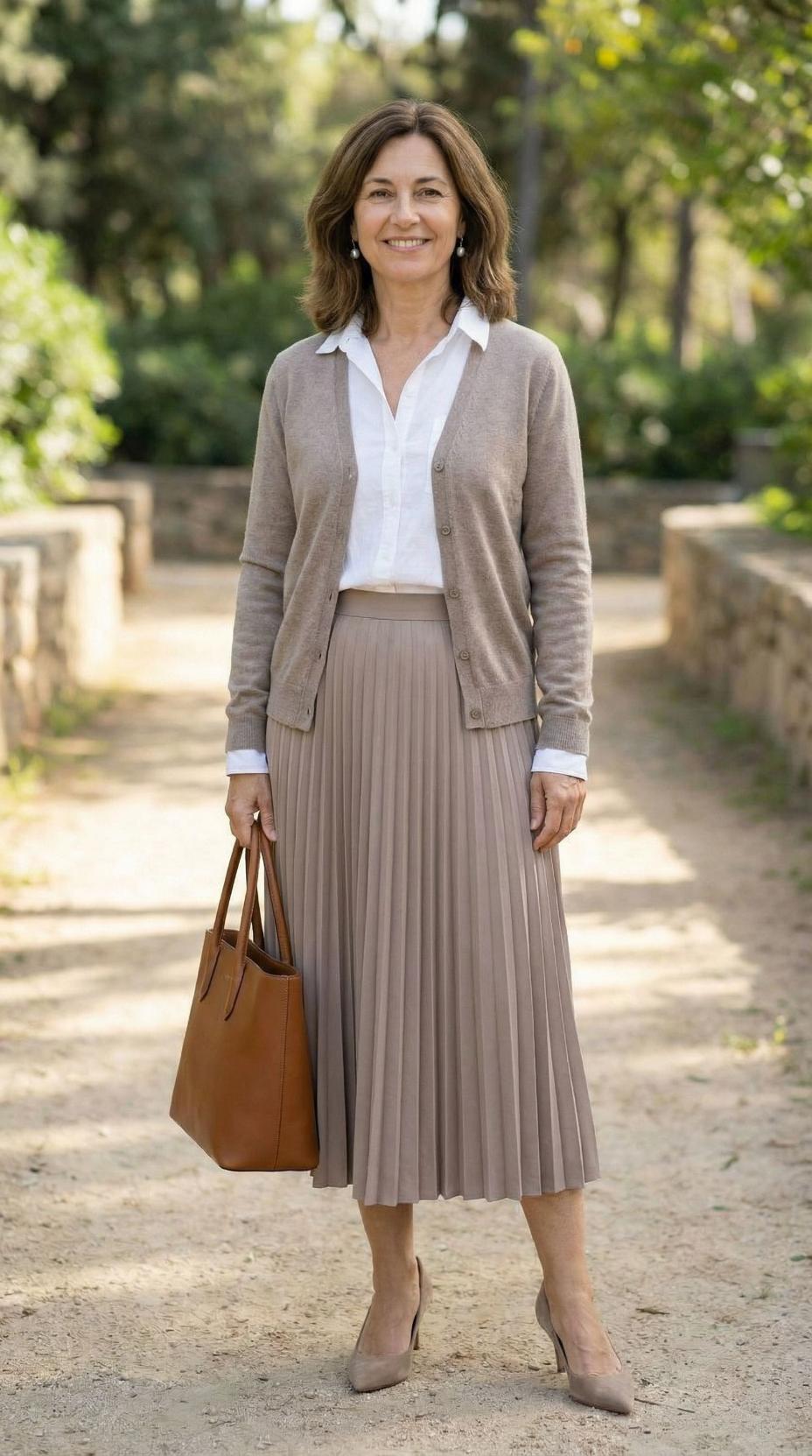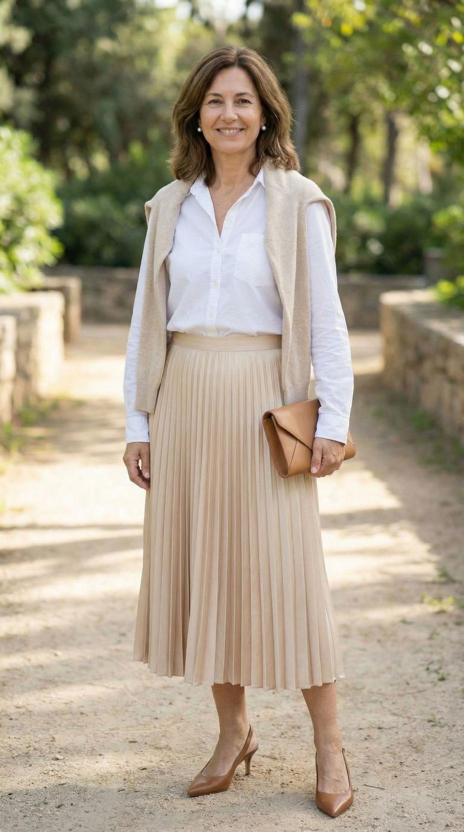 This sophisticated ensemble perfectly demonstrates how a crisp white button-up shirt can be the foundation for polished, age-appropriate styling. The layered approach with a neutral cardigan creates depth and texture while maintaining a refined silhouette. The pleated midi skirt adds feminine movement and the monochromatic palette keeps the look cohesive and elegant. This outfit strikes the perfect balance between professional and approachable, making it ideal for everything from client meetings to weekend brunches.