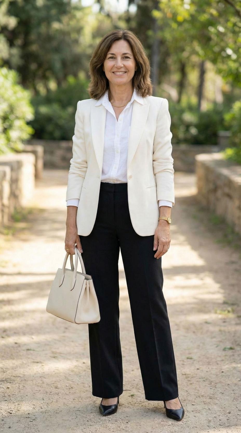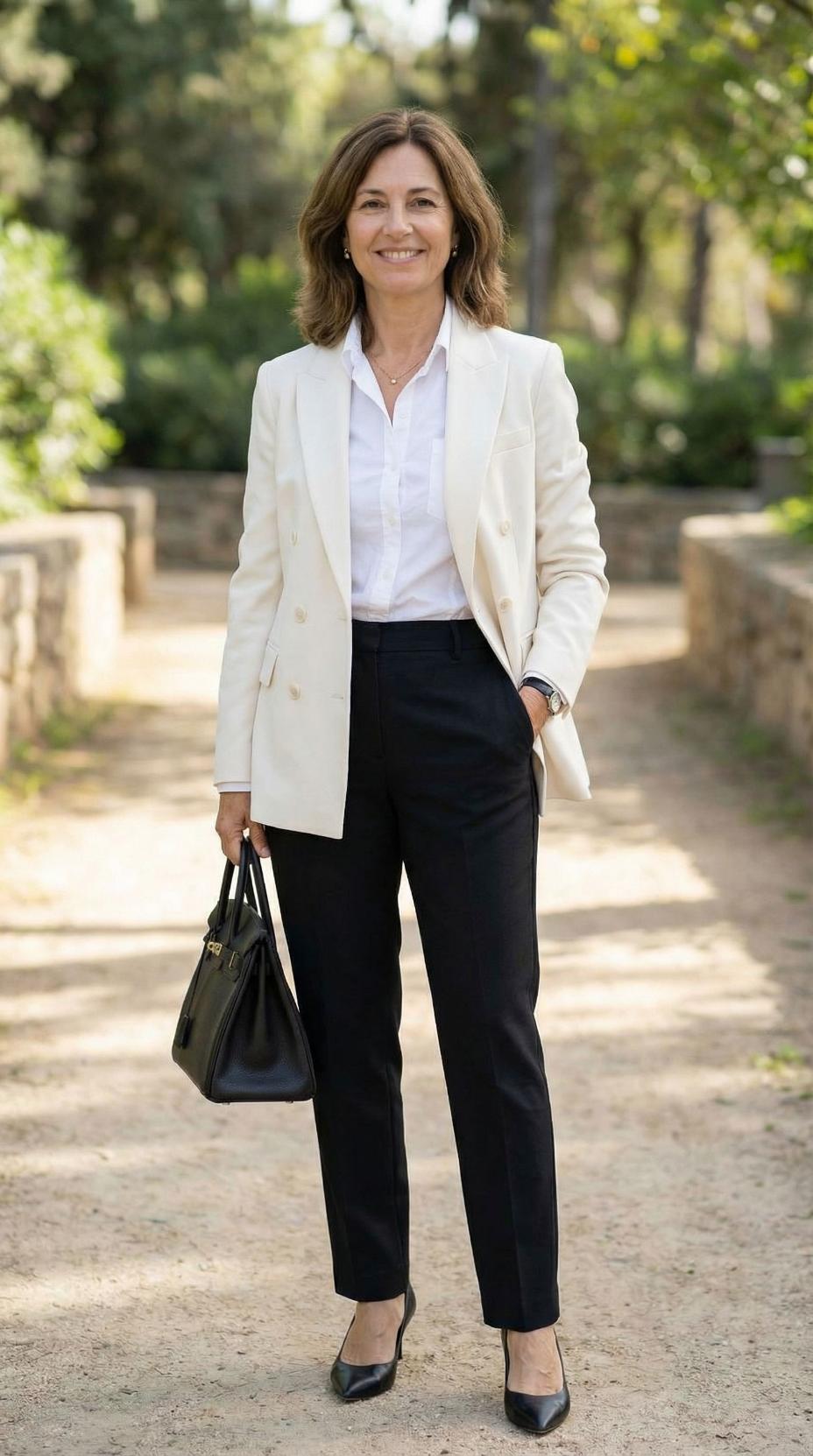 This timeless ensemble showcases the perfect foundation piece every 48-year-old woman needs in her wardrobe – a crisp white button-down shirt. Styled under a structured cream blazer and paired with tailored black trousers, this look epitomizes professional polish with effortless sophistication. The neutral color palette creates a streamlined silhouette that’s both office-appropriate and versatile enough for lunch meetings or evening events. The addition of classic accessories elevates this simple combination into a refined statement of understated luxury.