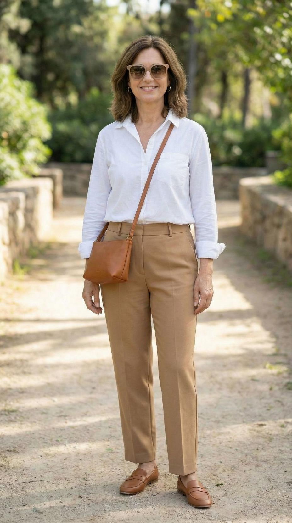 This timeless outfit perfectly demonstrates how a crisp white button-down shirt can create sophisticated yet approachable style for the modern 48-year-old woman. The clean lines of the white shirt paired with tailored neutral trousers create a polished look that transitions seamlessly from professional settings to casual weekend activities. The addition of coordinating leather accessories ties the entire ensemble together, proving that sometimes the most impactful outfits are built on classic foundations. This look embodies effortless elegance while remaining comfortable and practical for everyday wear.