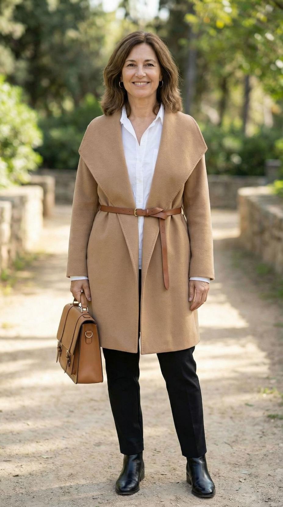 This timeless ensemble perfectly demonstrates how a crisp white button-up shirt becomes the foundation for sophisticated autumn styling. The oversized camel coat with its dramatic lapels and belt creates a chic silhouette that’s both professional and effortlessly elegant. Paired with sleek black trousers and ankle boots, this look strikes the perfect balance between classic and contemporary. The monochromatic brown leather accessories tie the entire outfit together, proving that a white shirt can be the versatile hero piece in any mature woman’s wardrobe. This outfit is ideal for business meetings, lunch dates, or any occasion where polished sophistication is key.
