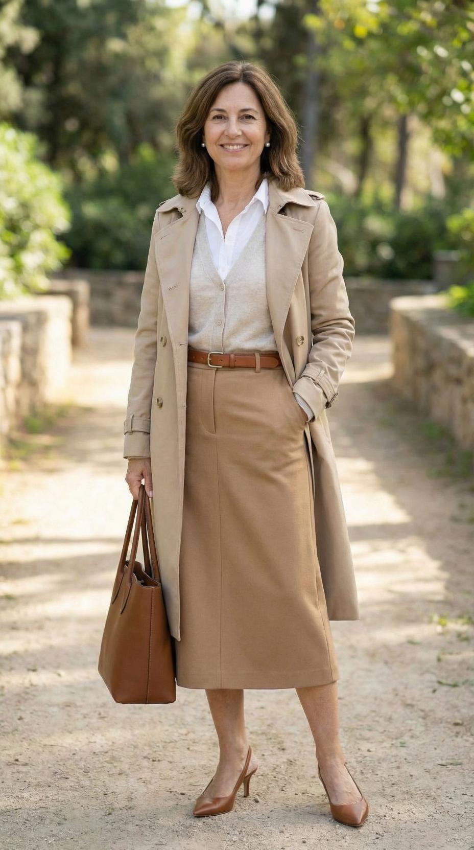 This elegant ensemble showcases the versatility of a crisp white button-up shirt when styled with tonal neutrals. The layered approach – featuring a classic trench coat over a coordinated vest and midi skirt – creates a polished, professional look perfect for spring weather. The monochromatic camel palette paired with the white shirt delivers timeless sophistication that works beautifully for business meetings, lunch dates, or casual city strolling. The structured silhouettes and quality fabrics elevate this outfit beyond basic, proving that neutral dressing can be both chic and interesting.