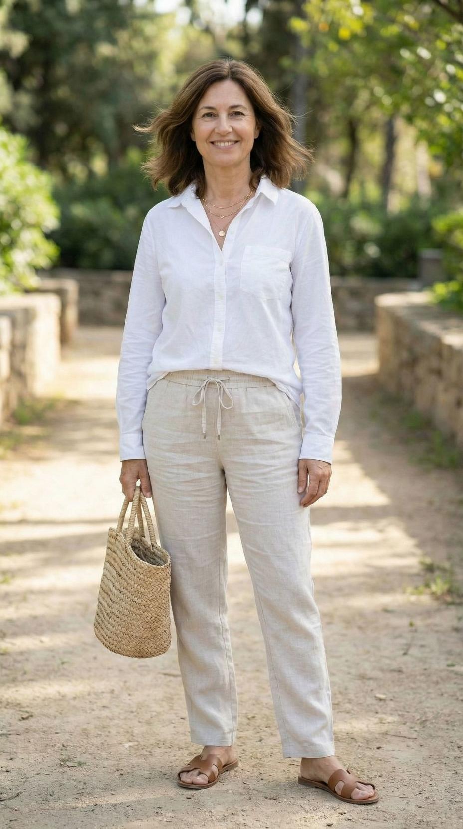 This timeless combination proves that simplicity never goes out of style. The crisp white button-down shirt is perfectly styled with relaxed wide-leg pants in a neutral tone, creating an effortlessly chic look that’s perfect for weekend brunches, casual business meetings, or strolling through farmers markets. The outfit is elevated with delicate layered jewelry and finished with a natural woven tote that adds texture and practicality. This ensemble demonstrates how classic pieces can create a sophisticated, age-appropriate look that feels both polished and comfortable.