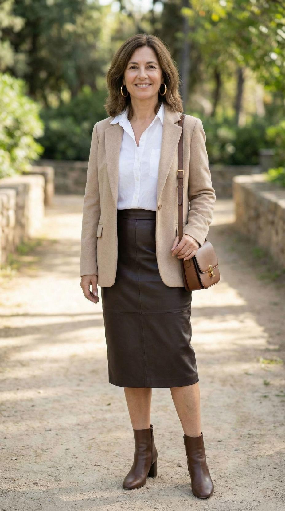 This timeless ensemble demonstrates how a classic white button-down shirt can anchor a sophisticated autumn-inspired outfit. The neutral blazer creates a polished silhouette while the rich cognac leather accessories add warmth and luxury. This look is perfect for business meetings, lunch dates, or any occasion where you want to appear effortlessly chic. The midi-length leather skirt adds modern sophistication, while the ankle boots provide both comfort and style. The coordinated leather accessories create a cohesive, put-together appearance that’s both professional and fashion-forward.