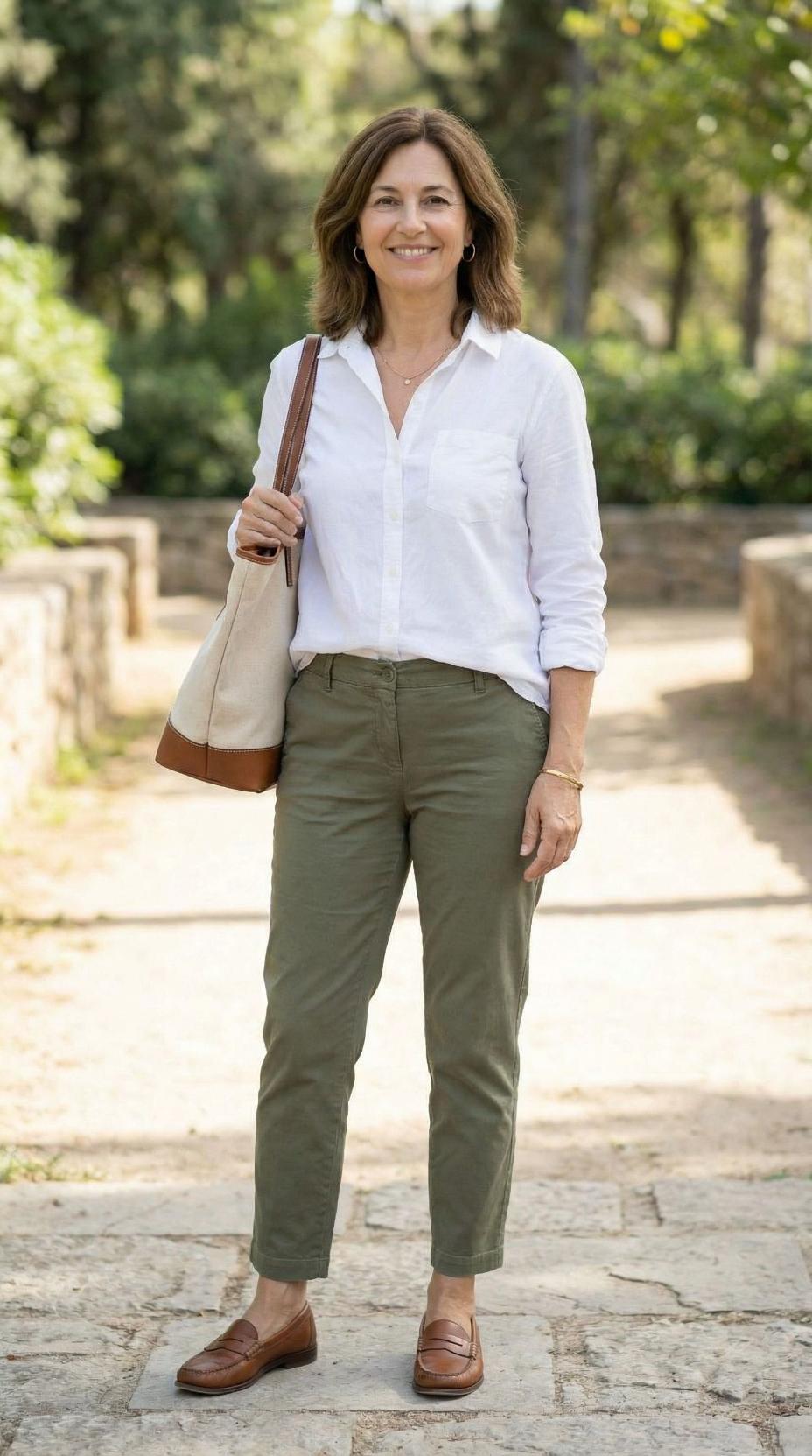 This timeless combination proves that simple can be sophisticated. The crisp white button-down shirt is styled casually with the sleeves rolled up and worn untucked for a relaxed yet polished look. Paired with tailored olive green chinos, this outfit strikes the perfect balance between comfort and refinement. The earth-toned accessories – from the cognac leather loafers to the two-toned canvas and leather tote bag – add warmth and texture to complete this effortlessly chic ensemble. This versatile look works beautifully for casual Friday at the office, weekend errands, or a relaxed lunch date.