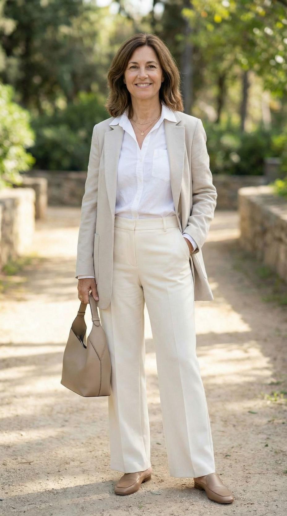 This stunning monochromatic neutral ensemble perfectly demonstrates how to elevate a classic white button-down shirt into sophisticated workwear. The crisp white shirt is styled open at the collar and tucked into high-waisted wide-leg trousers, creating a flattering silhouette. The coordinating beige blazer adds structure while maintaining the relaxed elegance that’s perfect for a 48-year-old woman who wants to look polished yet approachable. The neutral palette is timeless and versatile, while the comfortable flat shoes make this outfit practical for busy days. This look proves that sometimes the most impactful outfits come from mastering the basics with impeccable fit and styling.