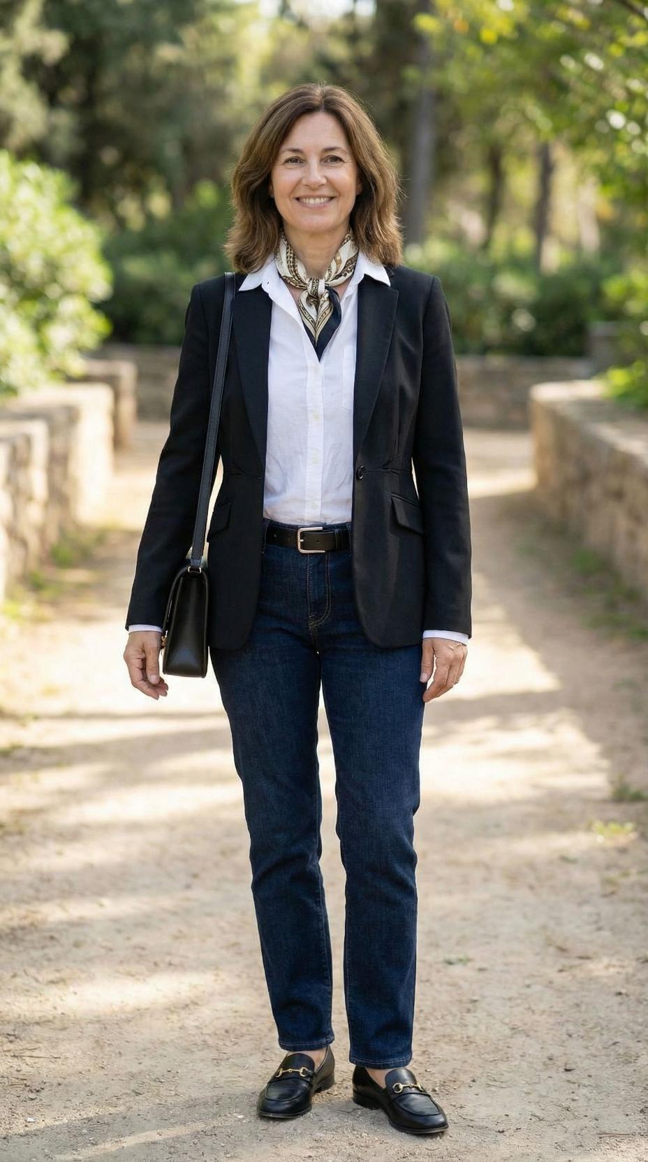 This timeless ensemble demonstrates how a classic white button-up shirt becomes the foundation for effortless sophistication. The crisp white shirt is elevated with a silk paisley scarf tied at the neck, adding a touch of Parisian chic to the look. Paired with a tailored navy blazer and dark wash straight-leg jeans, this outfit strikes the perfect balance between polished and approachable. The addition of black leather loafers with gold hardware keeps the look grounded while maintaining an air of refinement. This versatile combination works beautifully for business casual settings, weekend brunches, or any occasion where you want to look put-together without being overly formal. The key to nailing this look is in the fit – ensure your blazer is tailored through the waist and your jeans have a clean, straight silhouette.