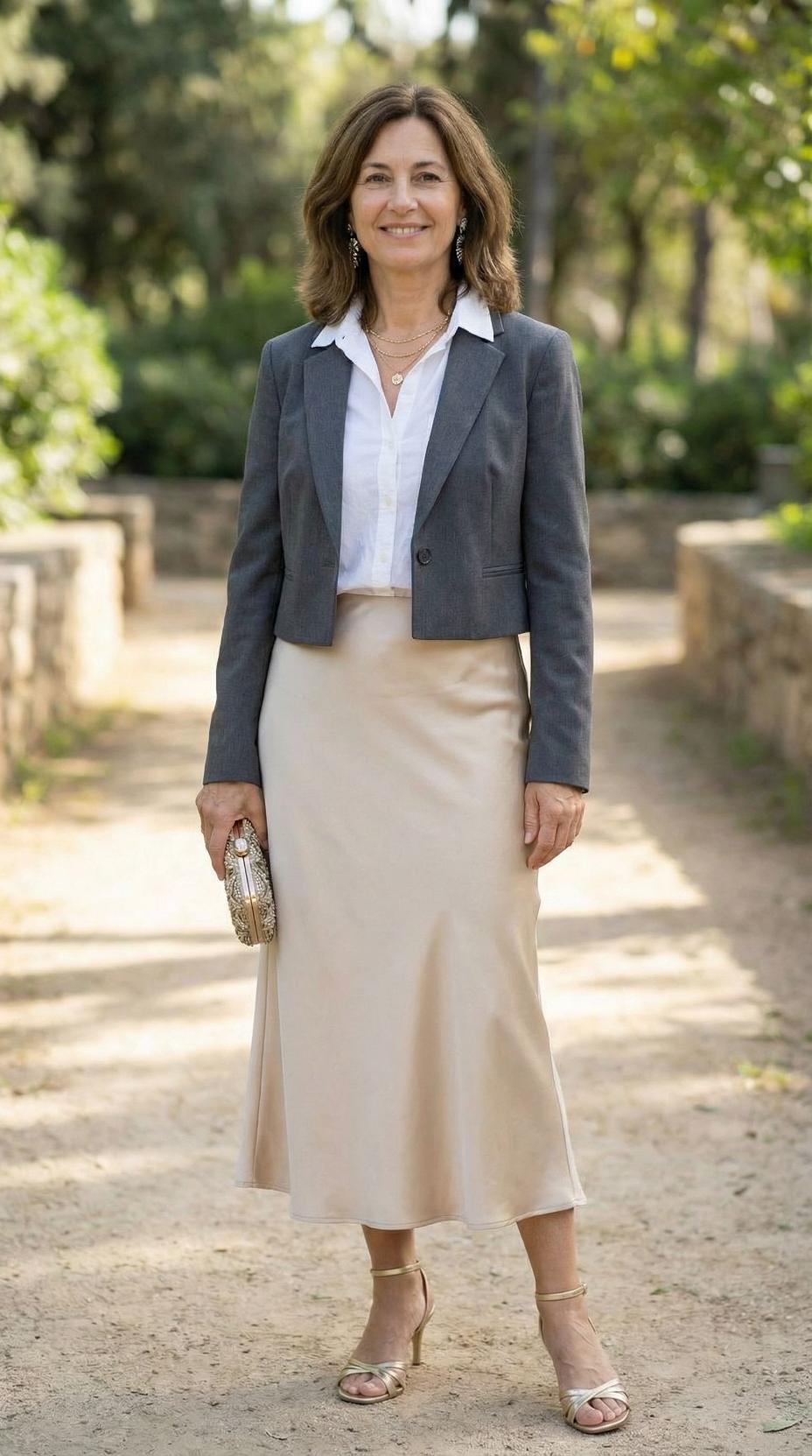 This sophisticated ensemble perfectly demonstrates how a classic white button-down can be elevated into an effortlessly elegant look perfect for a 48-year-old woman. The crisp white shirt is styled with a beautiful pleated midi skirt in soft neutral tones and layered with a complementary vest for added dimension. The monochromatic color palette creates a cohesive, polished appearance that’s both professional and feminine. This outfit strikes the perfect balance between classic sophistication and modern style, making it ideal for everything from business meetings to weekend brunches. The midi-length pleated skirt adds movement and grace, while the structured vest provides a contemporary twist on traditional layering.