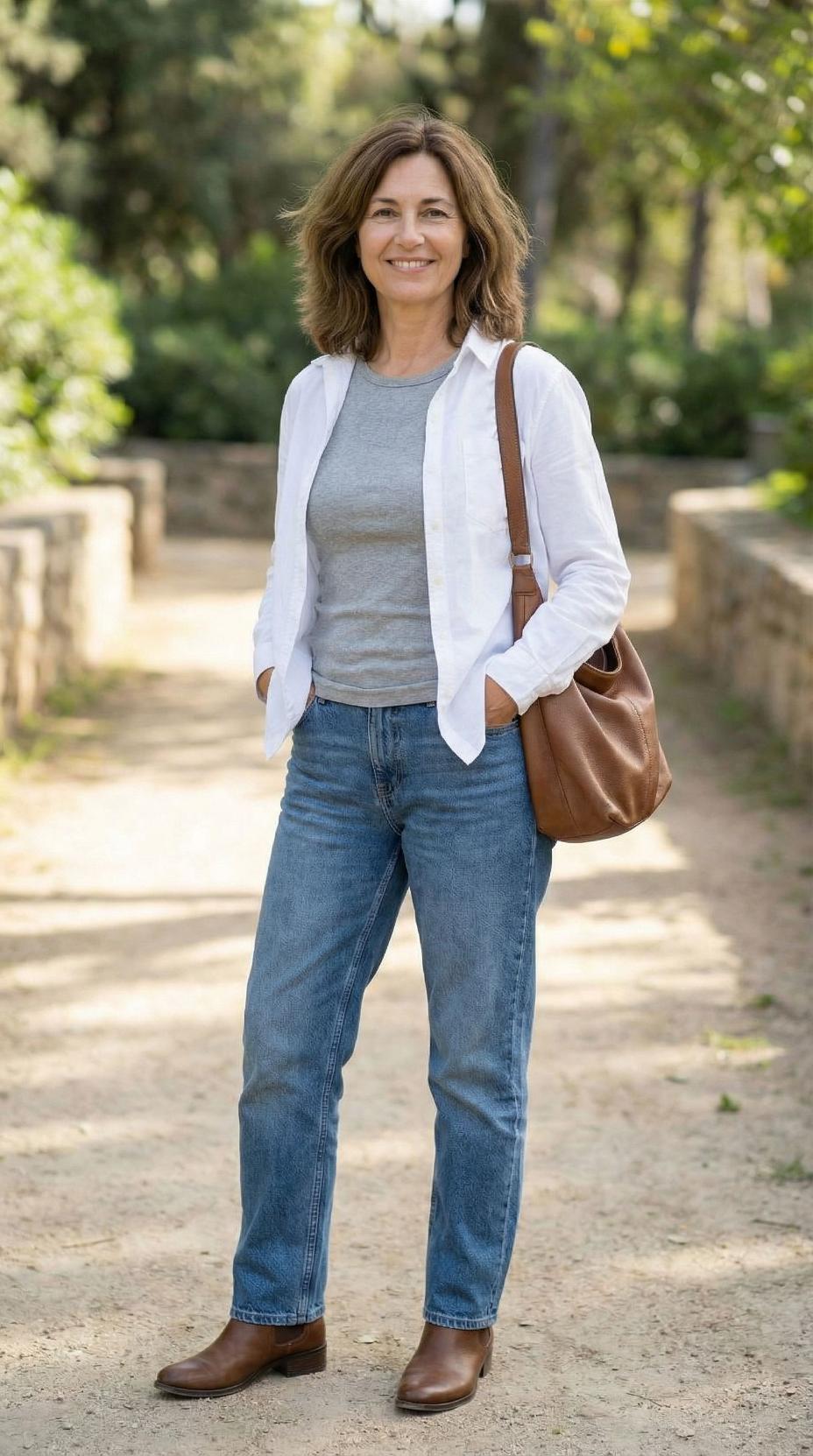 This timeless combination proves that simplicity never goes out of style. The crisp white button-down shirt worn open as a light jacket creates the perfect layered look when paired with a fitted grey tank top and dark wash skinny jeans. The relaxed yet polished ensemble is completed with comfortable brown leather sneakers and a matching shoulder bag – ideal for everything from casual coffee dates to weekend errands. This versatile outfit formula works beautifully for the modern 48-year-old woman who values both comfort and style.