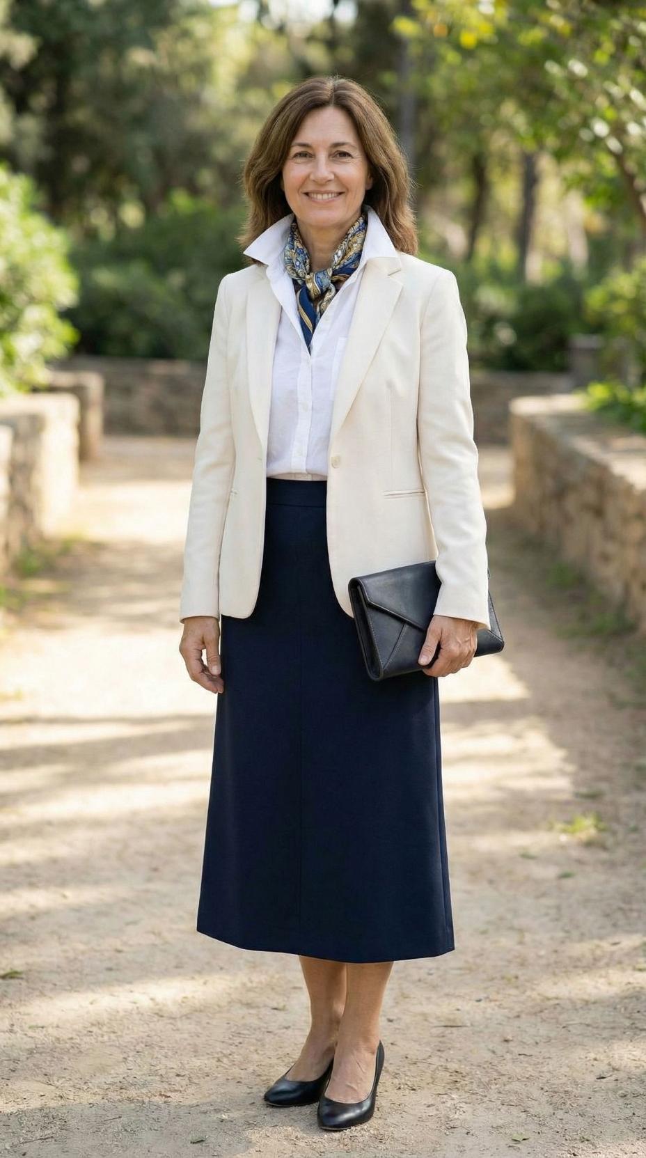 This sophisticated ensemble perfectly demonstrates how a classic white button-up can anchor an elegant professional look. The crisp white shirt is layered beautifully under a structured cream blazer, paired with a navy midi skirt that hits at the perfect midi length. The addition of a patterned silk scarf adds visual interest and a touch of European sophistication, while the sleek clutch and classic pumps complete this timeless yet contemporary outfit. This look is ideal for business meetings, lunch dates, or any occasion where you want to appear polished and put-together while maintaining comfort and style.