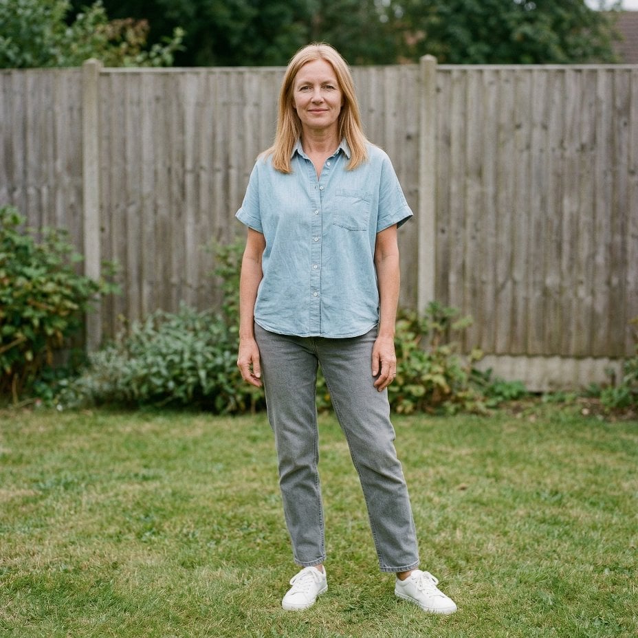 The before shows a light blue chambray button-up with a chest pocket, paired with grey five-pocket trousers in a casual backyard setting. Hair falls straight to the shoulders in a natural blonde.