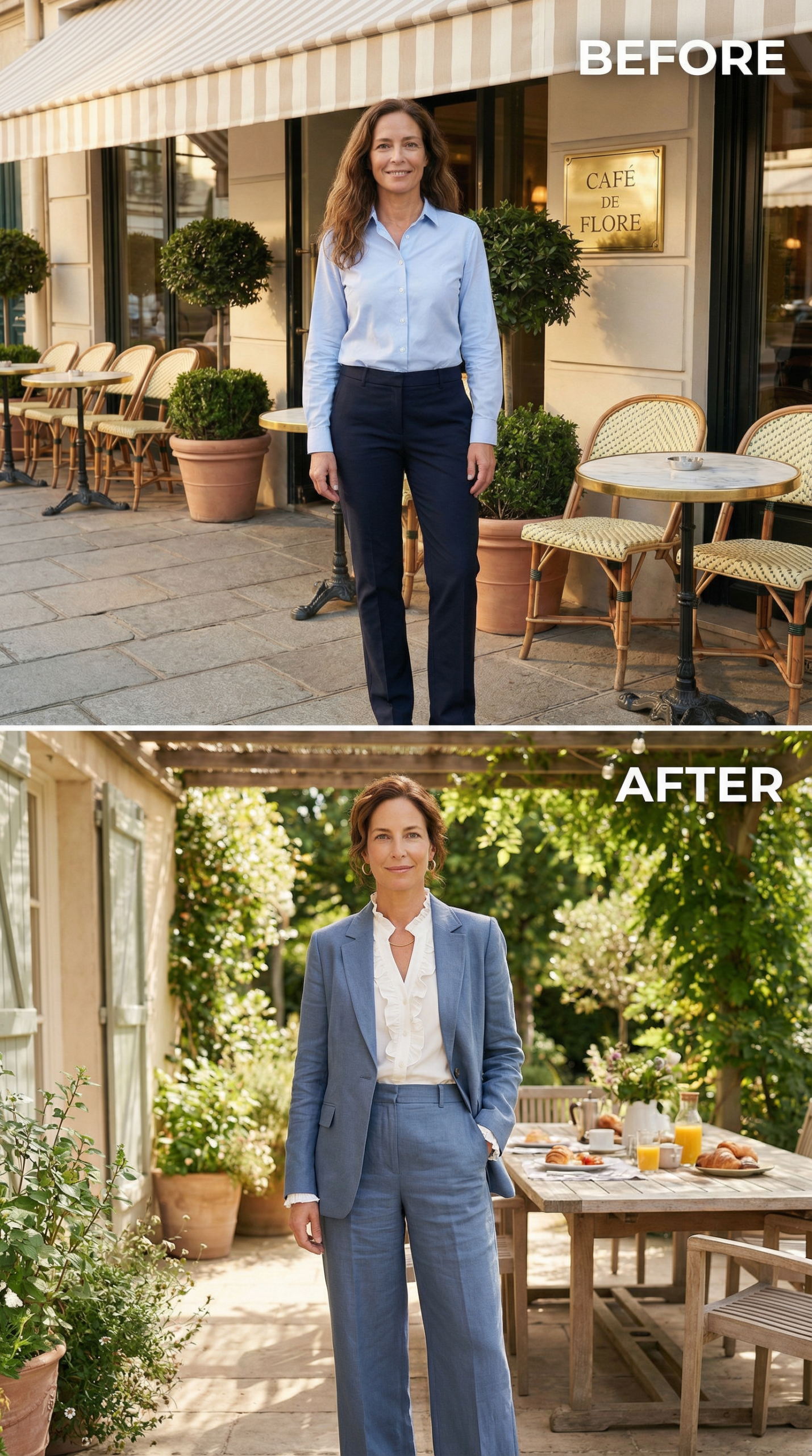 In the before photo, she stands outside Café de Flore in a pale blue cotton button-down tucked into straight-leg navy trousers — tidy, but flat in its effect. The after look replaces all of that with a slate-blue linen suit: single-breasted blazer with notched lapels, wide-leg trousers cut to the ankle, worn over a white ruffle-front blouse with a V-neckline and slightly visible cuff.