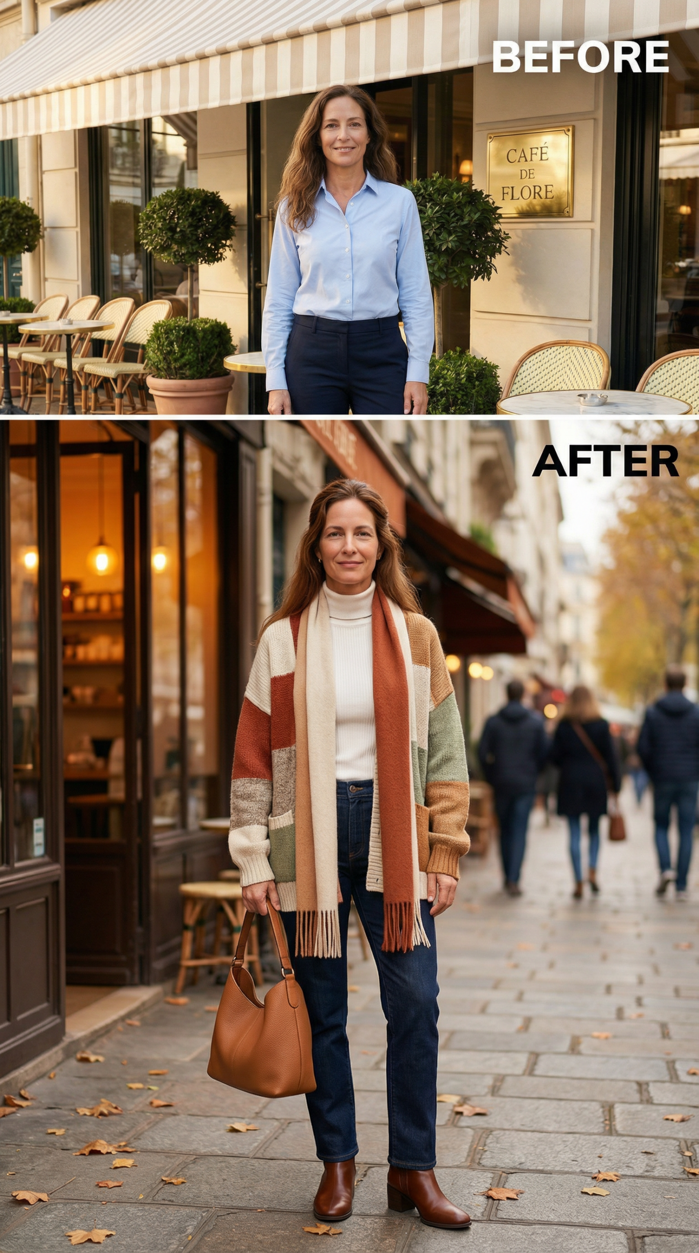 The accessories do real work here. A structured cognac tote with a single rolled leather handle echoes the boots exactly, creating a clean visual anchor at the bottom of the look. Autumn leaves scattered across the stone pavement behind her reinforce the seasonal palette rather than competing with it. Where the before outfit read as functional and forgettable, the after has a clear point of view rooted in earthy tones, mixed knit textures, and deliberate layering.