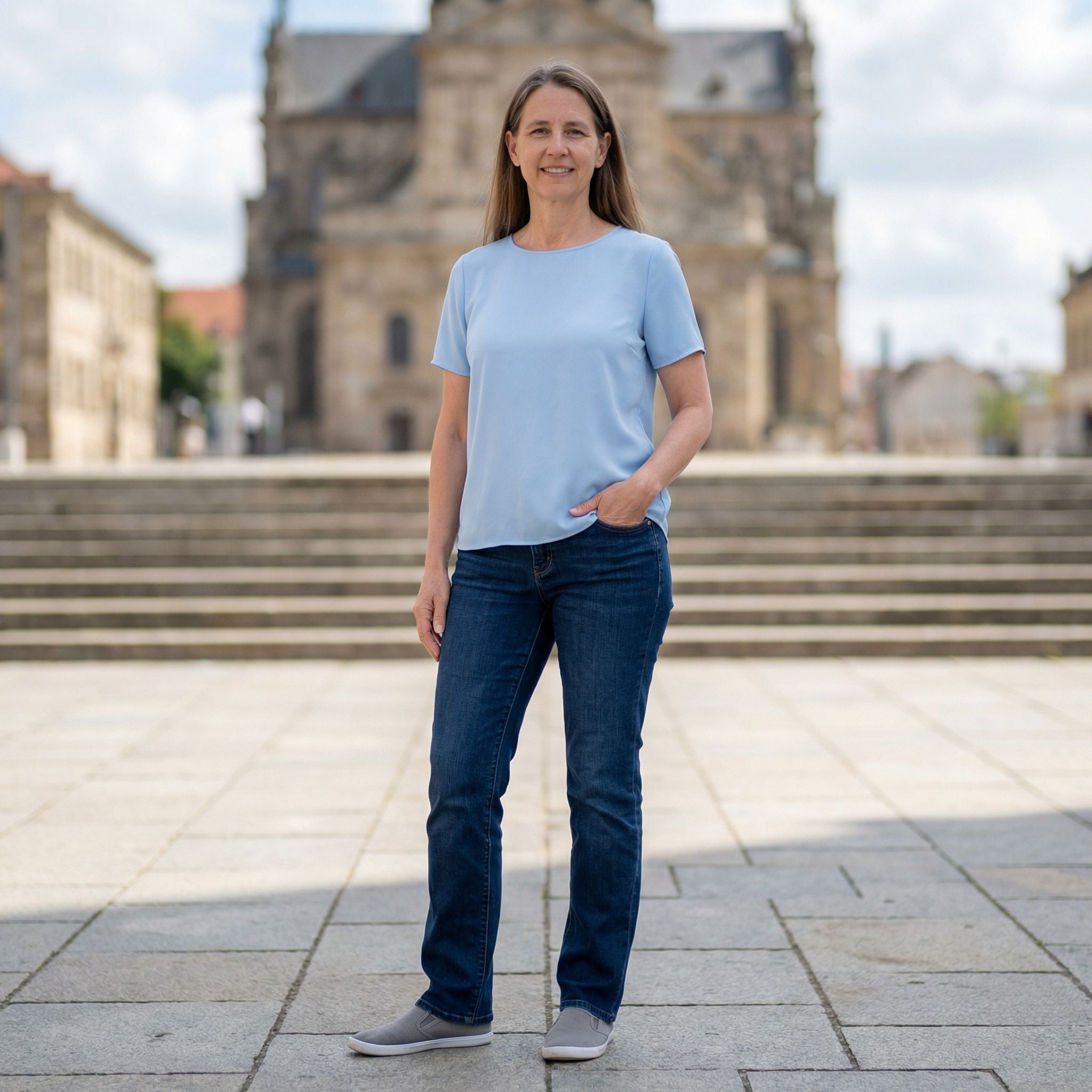 The before shows a casual urban uniform: a powder blue cotton tee with set-in sleeves, dark indigo straight-leg jeans, and grey canvas sneakers. Hair falls loose and center-parted on stone pavement.