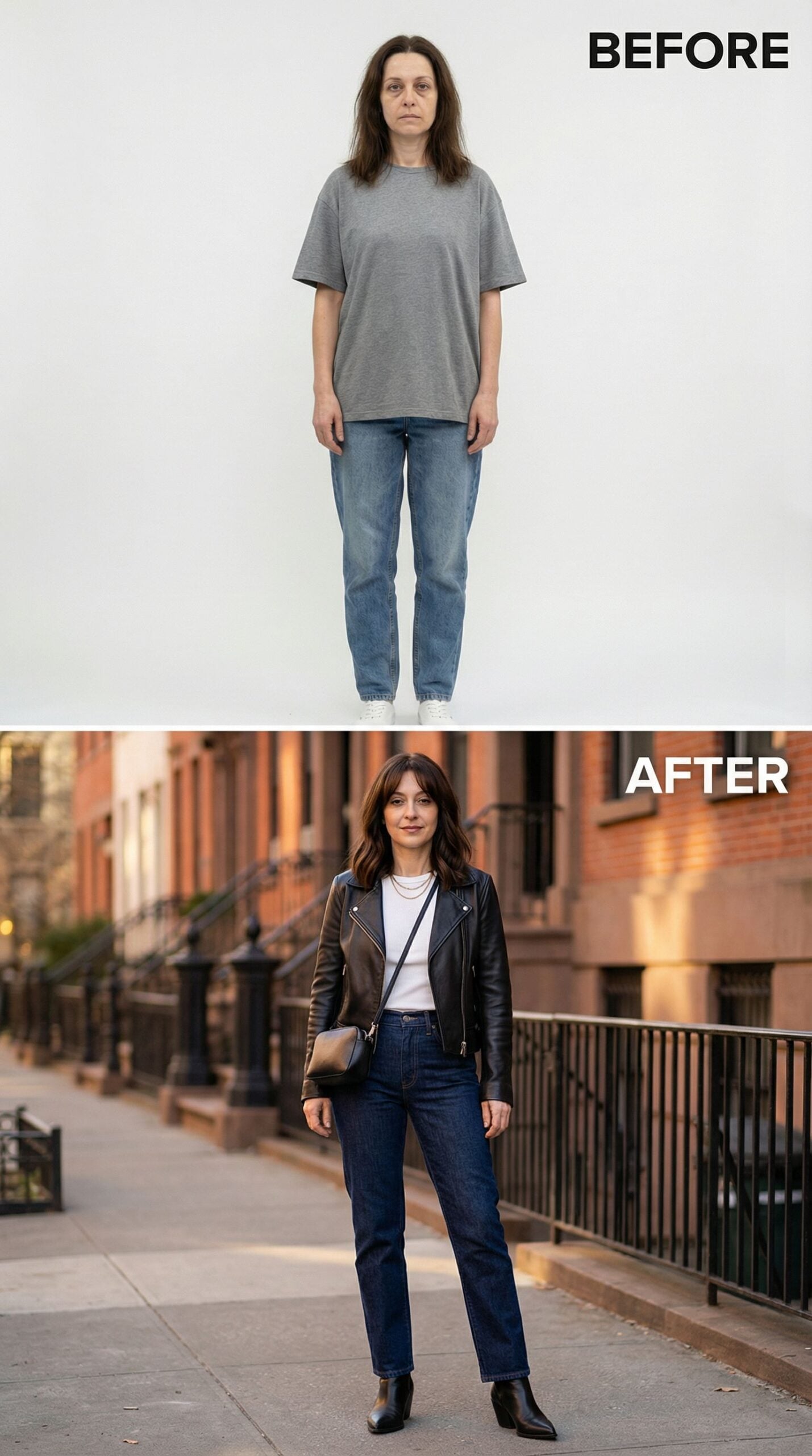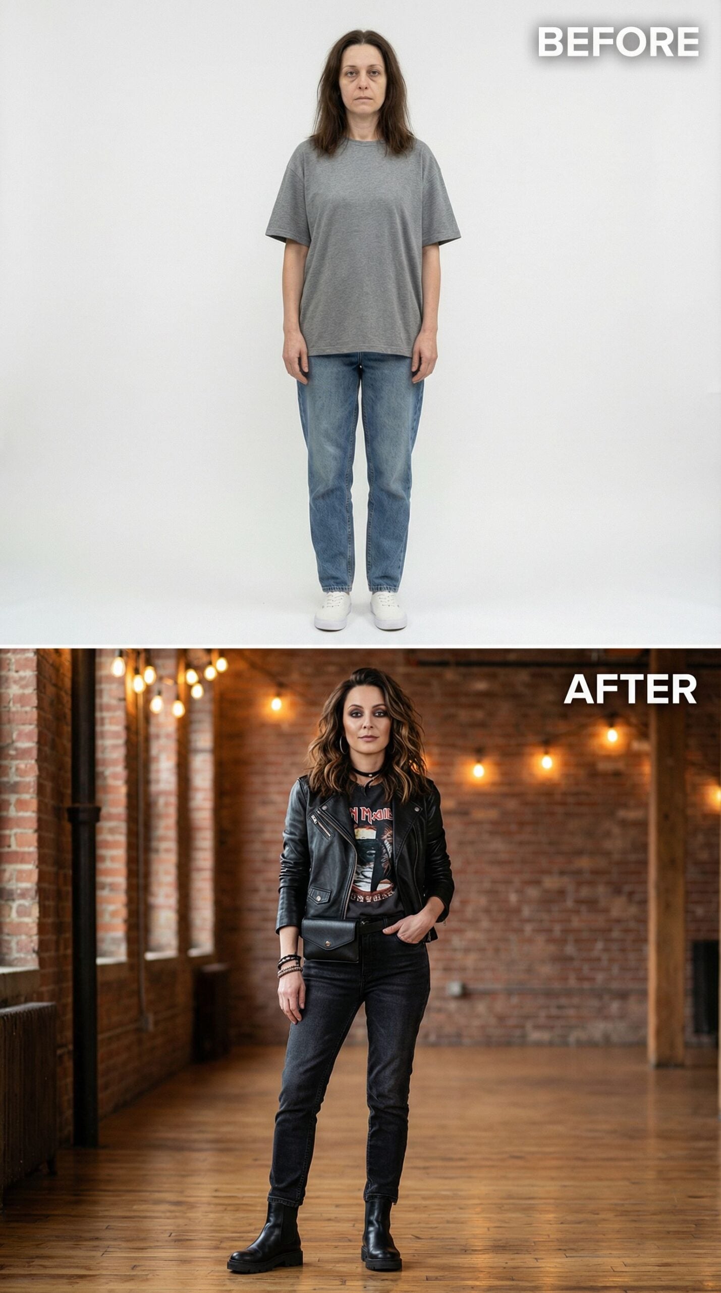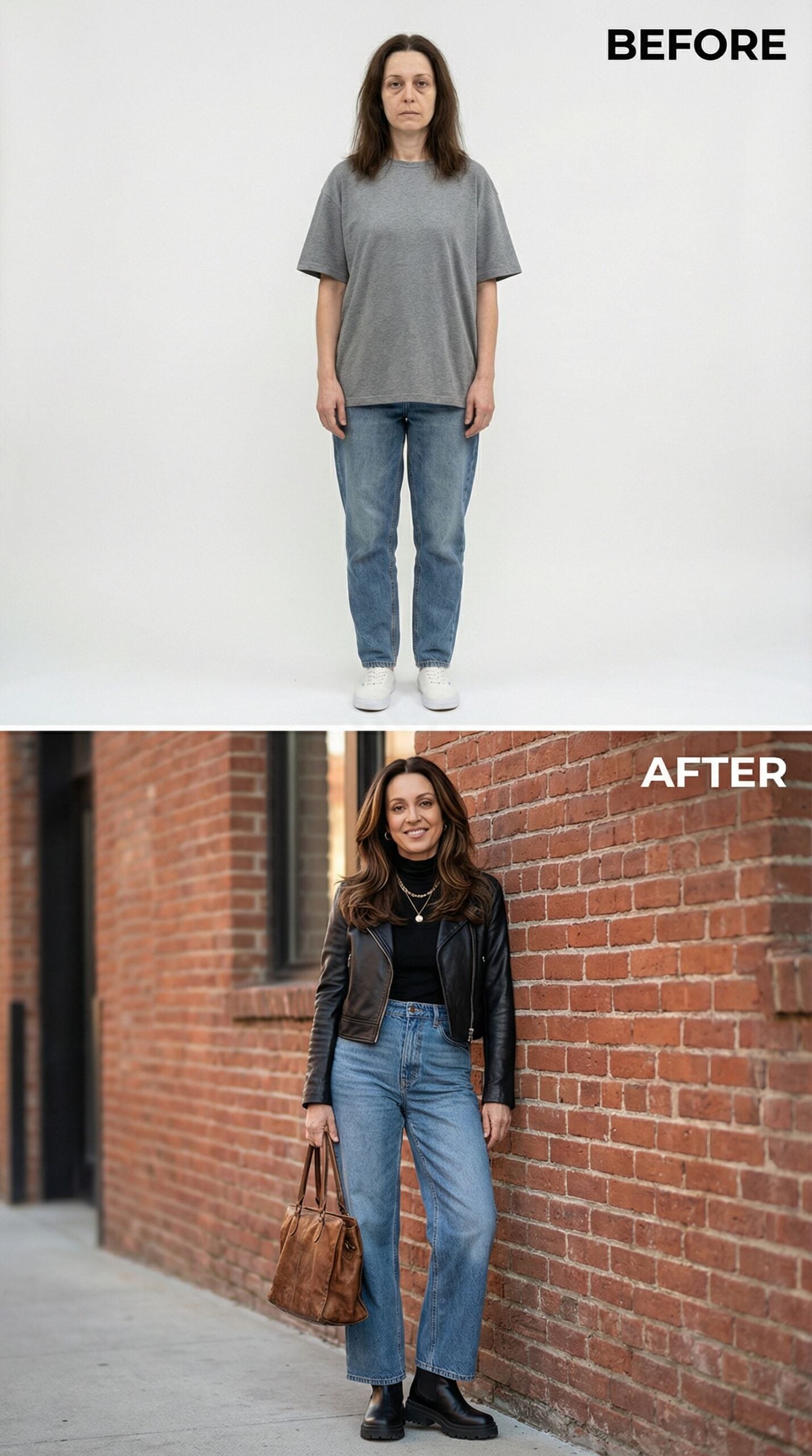 Black leather transforms everything in this dramatic makeover. The fitted motorcycle jacket pairs perfectly with dark wash jeans and combat boots, creating an effortlessly cool aesthetic. Layered accessories and tousled waves complete the edgy transformation. This rock-inspired look proves that Frumpy Woman can evolve into Brooklyn brownstone chic with the right pieces and confident styling choices.