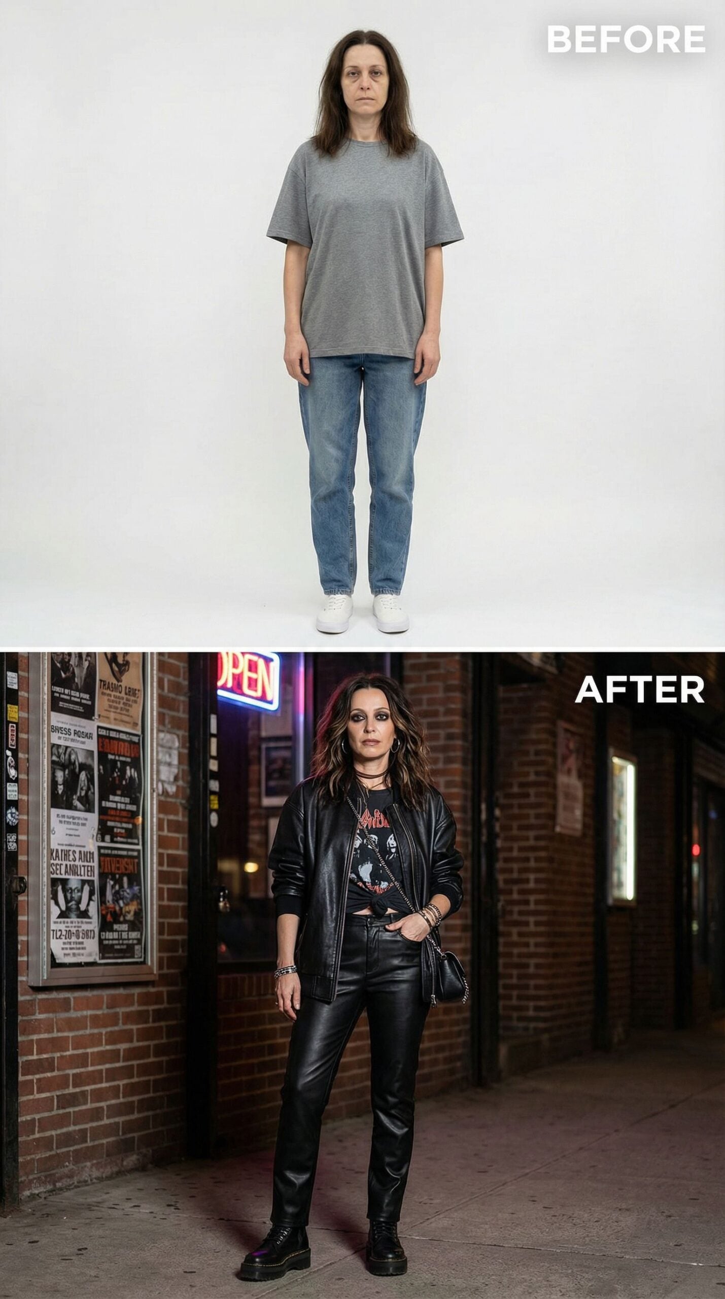 Leather becomes your armor in this complete style overhaul that screams urban sophistication. The transformation swaps basic casualwear for head-to-toe black leather—fitted pants, sleek jacket, and graphic band tee create an effortlessly cool ensemble. Dark smoky makeup and tousled waves complete this rock-chic metamorphosis that turns Frumpy Woman into a confident city dweller ready to conquer Brooklyn’s coolest neighborhoods.
