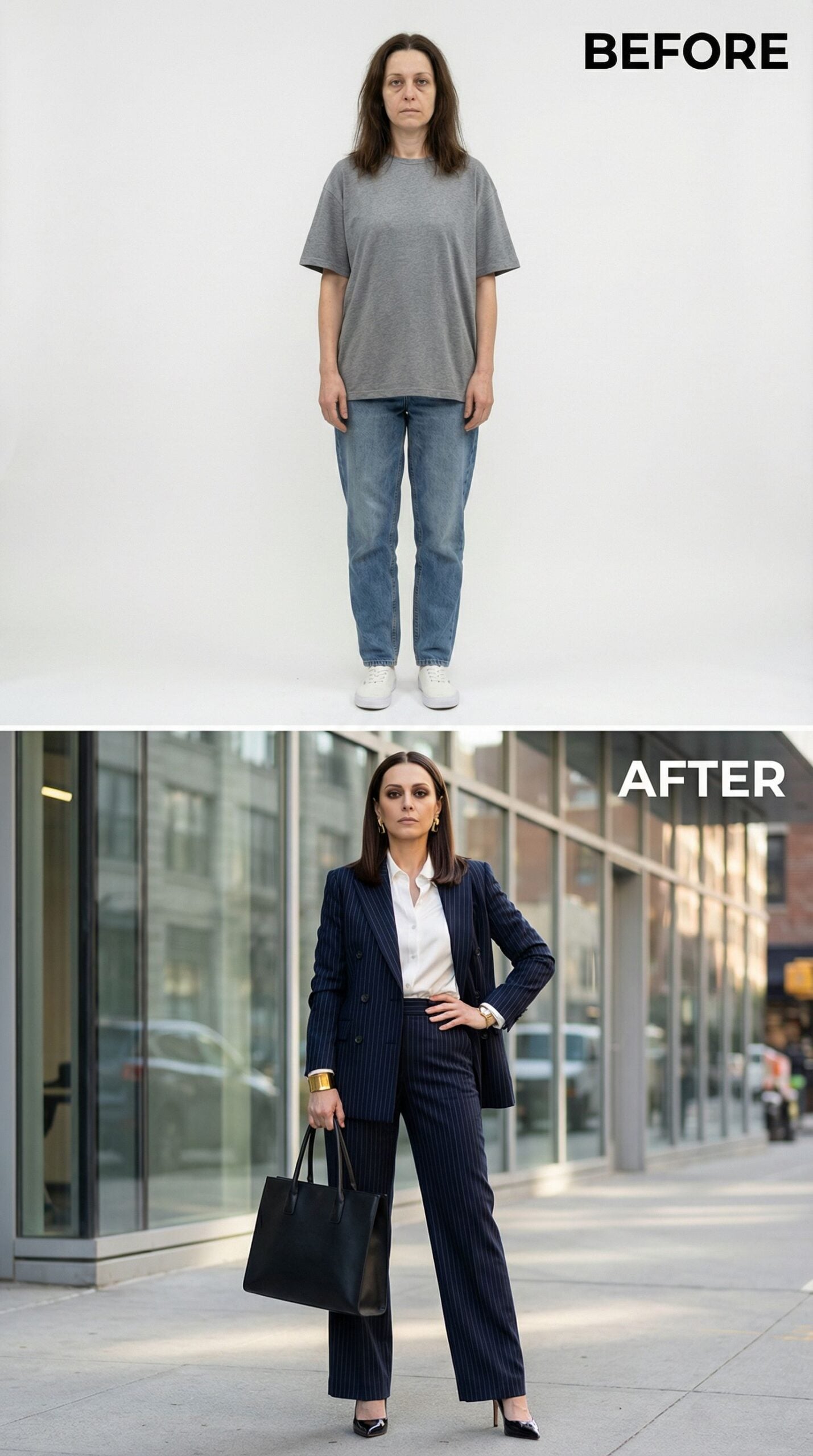 Frumpy Woman to Corporate Powerhouse in Navy Pinstripes