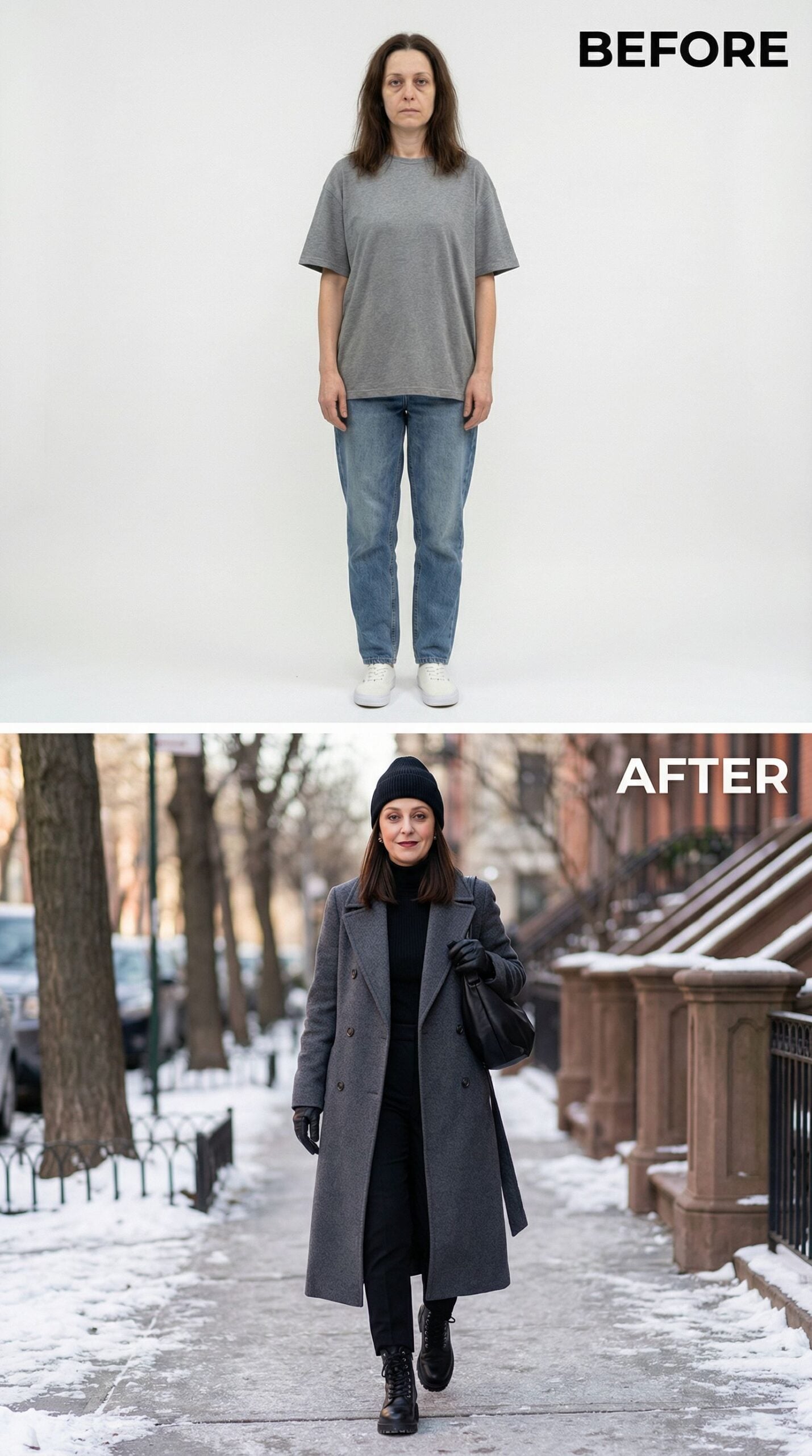 Transform your entire aesthetic with a structured gray wool coat that instantly elevates any basic outfit. The double-breasted silhouette creates sophisticated lines while the midi length adds polish to black basics underneath. A black beanie and leather boots complete this effortless winter look that screams expensive taste. This transformation proves outerwear makes all the difference in achieving that coveted Brooklyn brownstone sophistication.