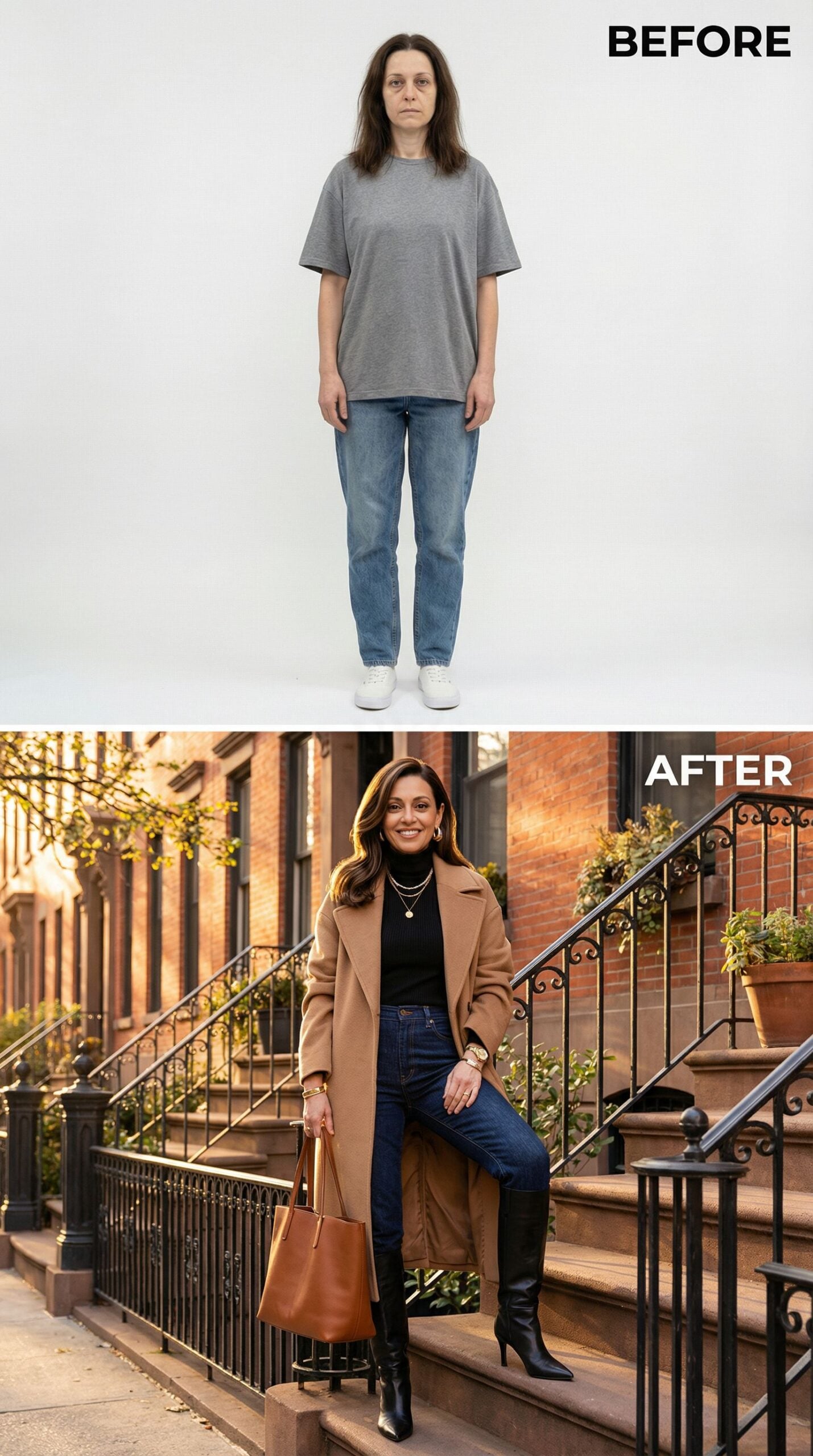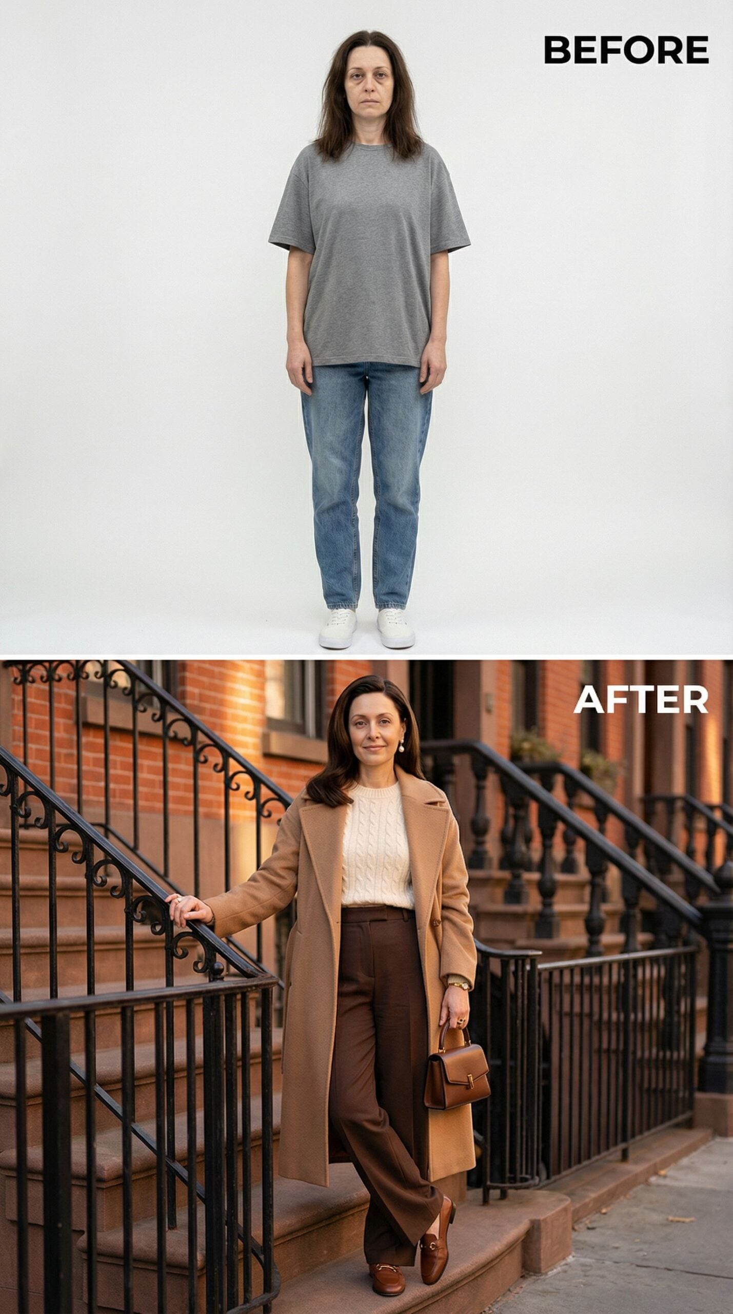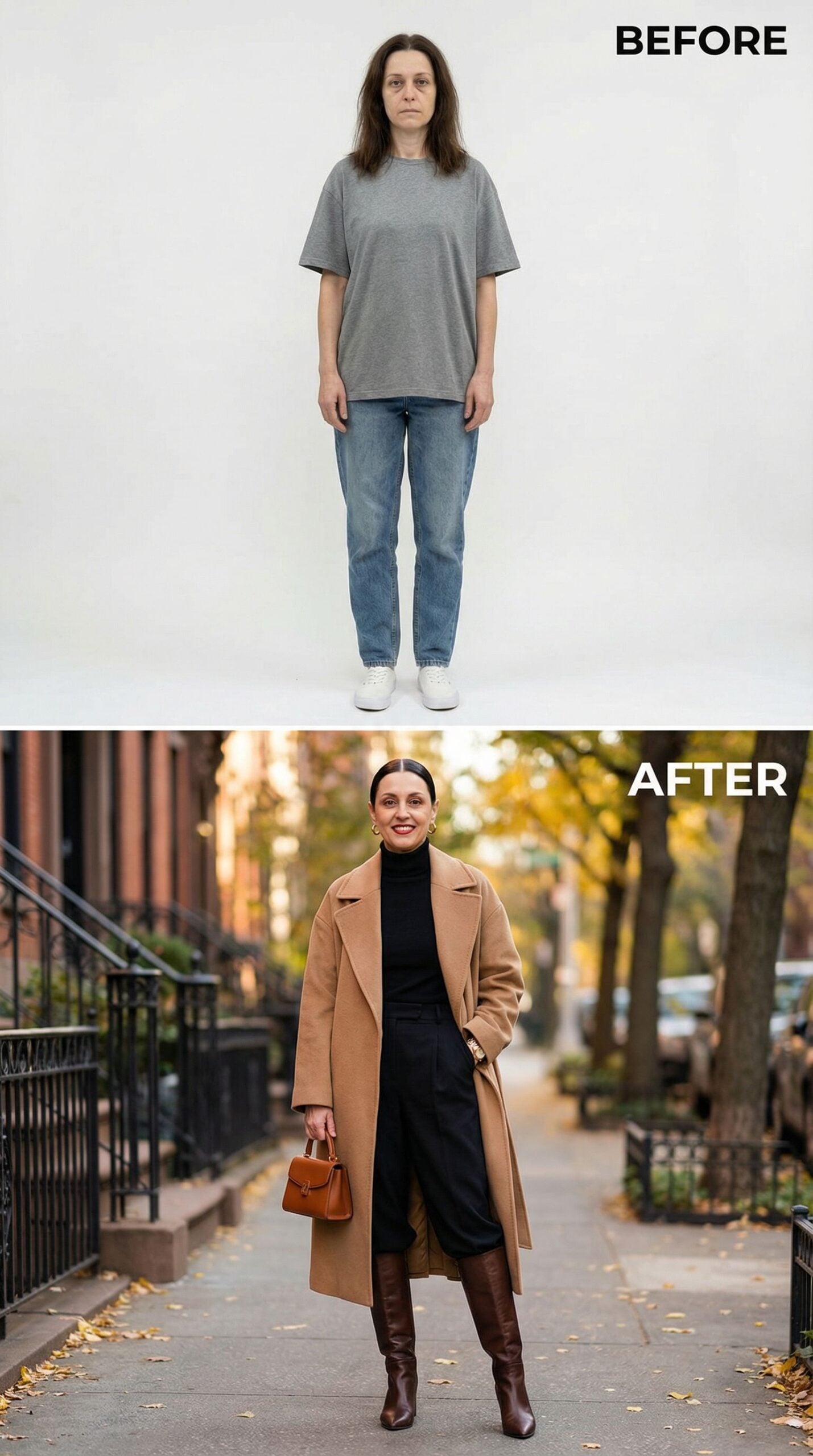Camel coats instantly elevate any wardrobe from basic to sophisticated brownstone living. The oversized gray tee and loose jeans transform into a curated cream cable-knit sweater, tailored chocolate trousers, and that essential camel wool coat. Brown leather loafers and a structured handbag complete this effortlessly polished neighborhood-strolling ensemble that screams “I belong on these historic steps.”