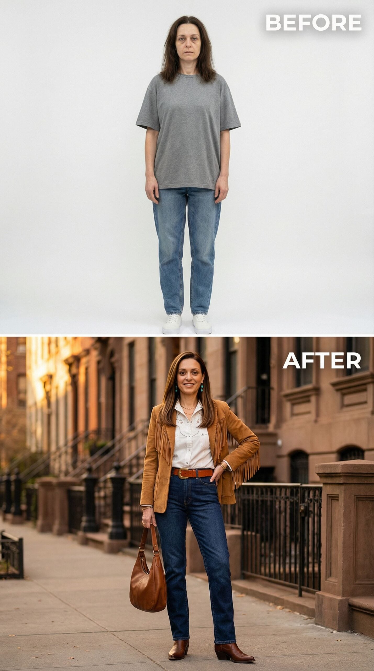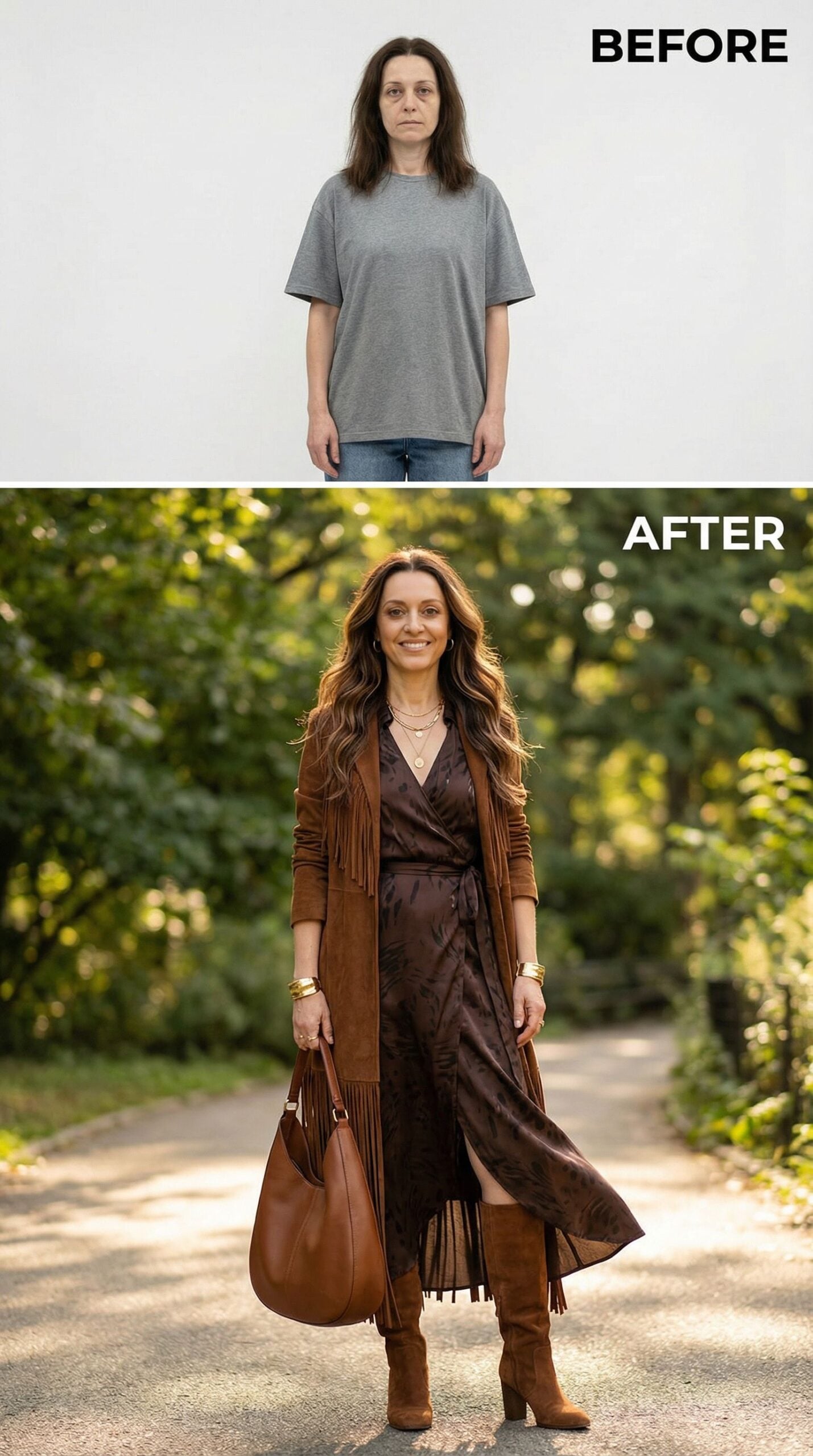 Rich chocolate tones create pure magic in this stunning makeover. The flowing wrap dress pairs perfectly with a fringed suede duster, while layered gold jewelry adds instant sophistication. Caramel highlights frame the face beautifully, and knee-high suede boots ground the bohemian elegance. This earthy palette transforms any woman into a confident style icon ready for city adventures.