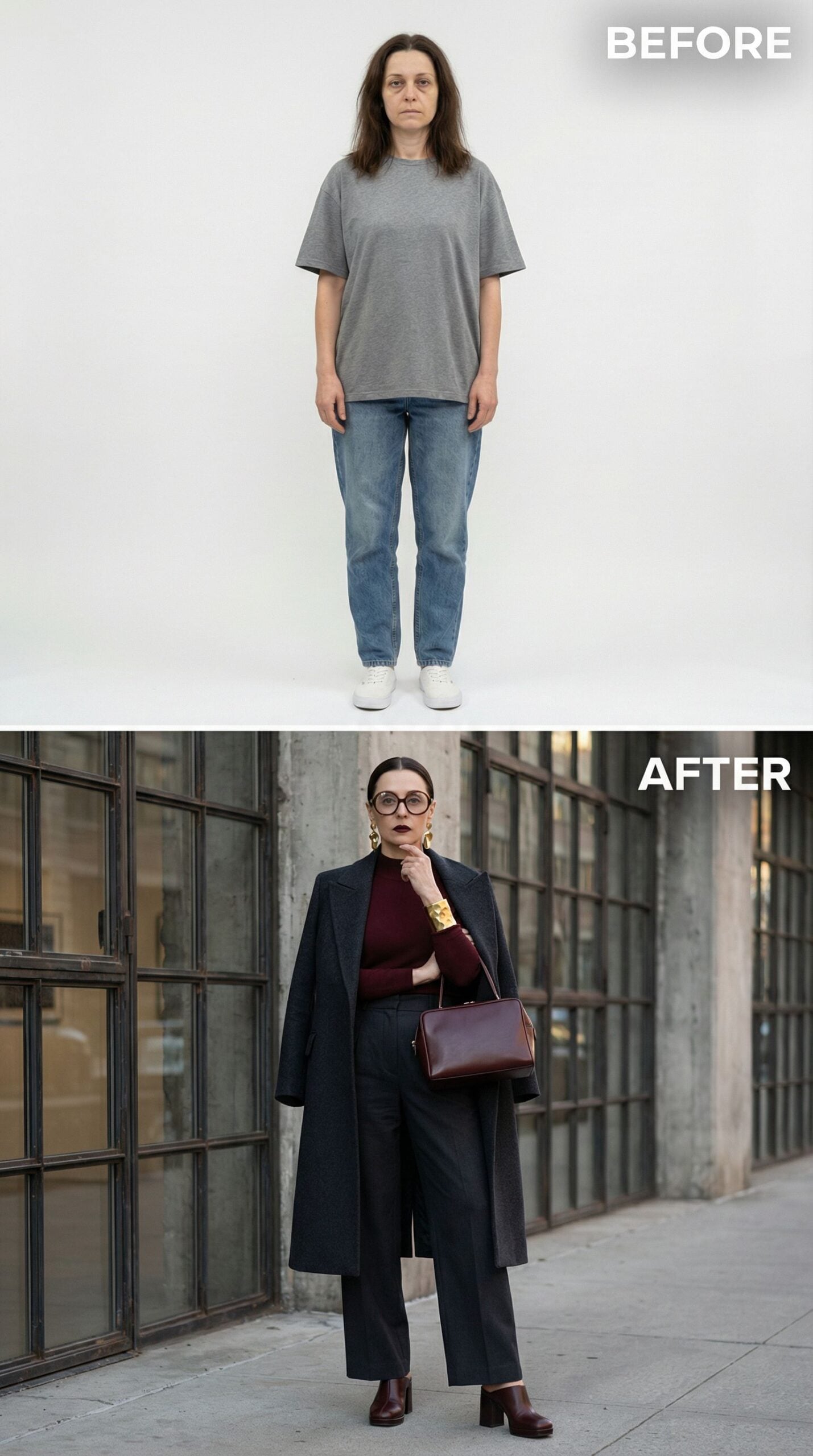 Burgundy knits anchor this polished transformation, proving that rich jewel tones instantly elevate any wardrobe. The tailored charcoal coat creates structure while tortoiseshell glasses add intellectual sophistication. Gold jewelry and a structured leather handbag complete the executive aesthetic. This refined ensemble takes Frumpy Woman from weekend casual to boardroom ready, demonstrating how strategic layering and premium accessories transform your entire presence into pure professional confidence.
