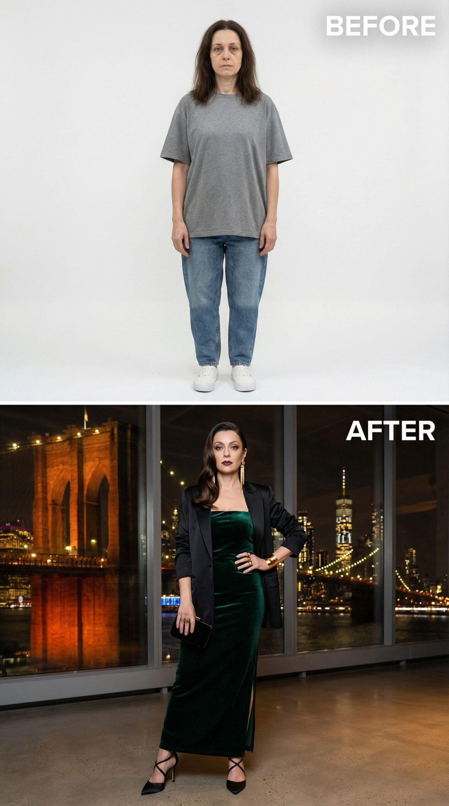 Velvet emerald evening wear transforms casual comfort into red-carpet glamour. The strapless column dress hugs curves while the tailored blazer adds sophisticated structure. Strappy black heels elongate legs, and the sleek side-swept hair creates Old Hollywood romance. Gold jewelry catches light beautifully against rich green velvet, proving Brooklyn brownstone elegance suits every woman ready to embrace her most confident self.