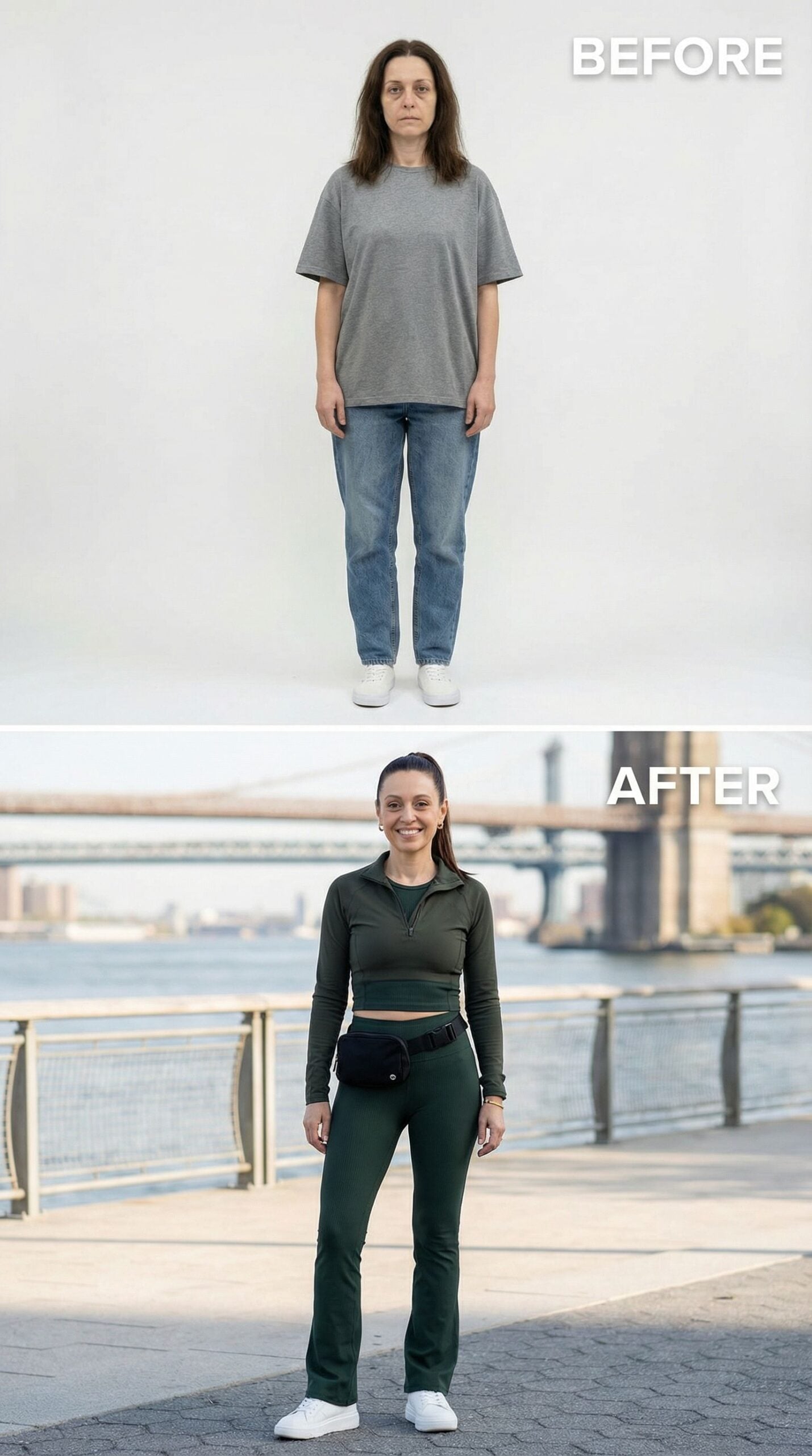 Athletic green coordinates replace oversized basics to create this polished sporty look. The fitted half-zip crop top pairs seamlessly with matching high-waisted leggings, while the crossbody bag adds urban functionality. This transformation proves that Frumpy Woman can embrace activewear as everyday fashion, delivering comfort without sacrificing style for busy Brooklyn days.