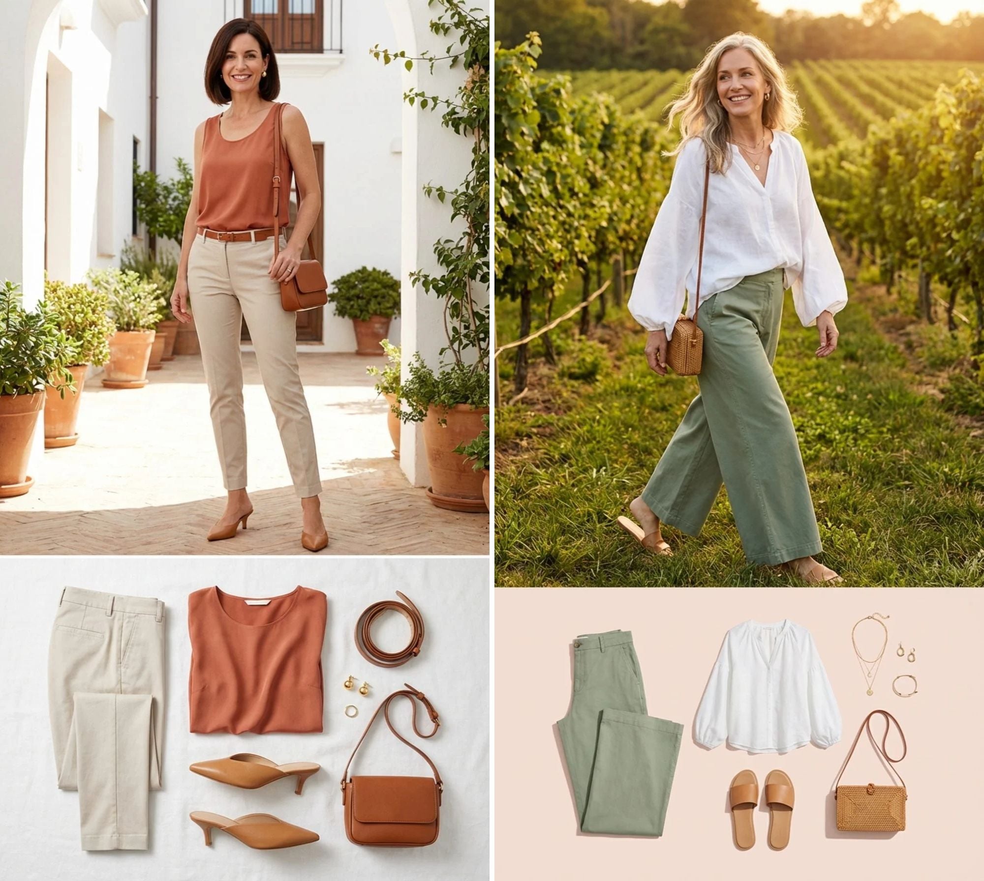 Chinos have quietly become the most interesting pant in a grown woman’s wardrobe. Not the stiff office-khaki version from twenty years ago, the current crop: relaxed wide legs in ivory linen blends, slim taupe cuts that tuck into sandals, cropped silhouettes that let a terracotta sweater do all the talking. They hold structure without demanding anything of you. This summer’s best chino outfits are built on that exact tension: a little polish, a lot of ease, and styling decisions that feel completely intentional.