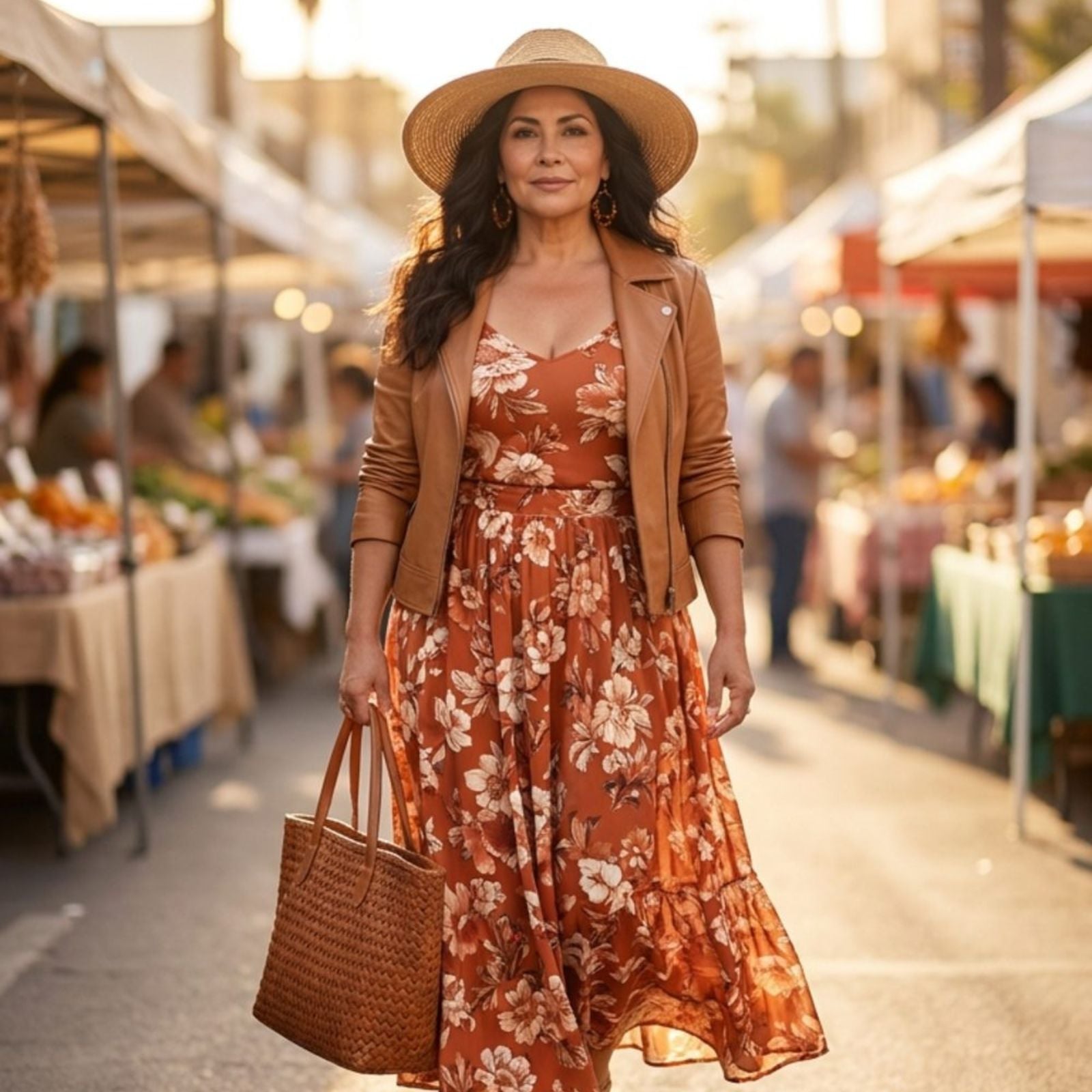 Wide-Brim Hat, Printed Maxi, and a Tan Leather Jacket That Ties the Story Together