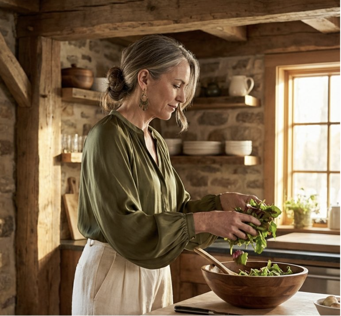 Olive silk brings earthy luxury to your hosting repertoire while hiding cooking splashes better than lighter shades. The flowing sleeves add drama when you gesture during conversation, and silk naturally regulates temperature as you move between hot kitchen and air-conditioned dining room. Antique brass accessories feel collected over time rather than bought all at once. This palette photographs beautifully in candlelight and makes everyone else look radiant too.