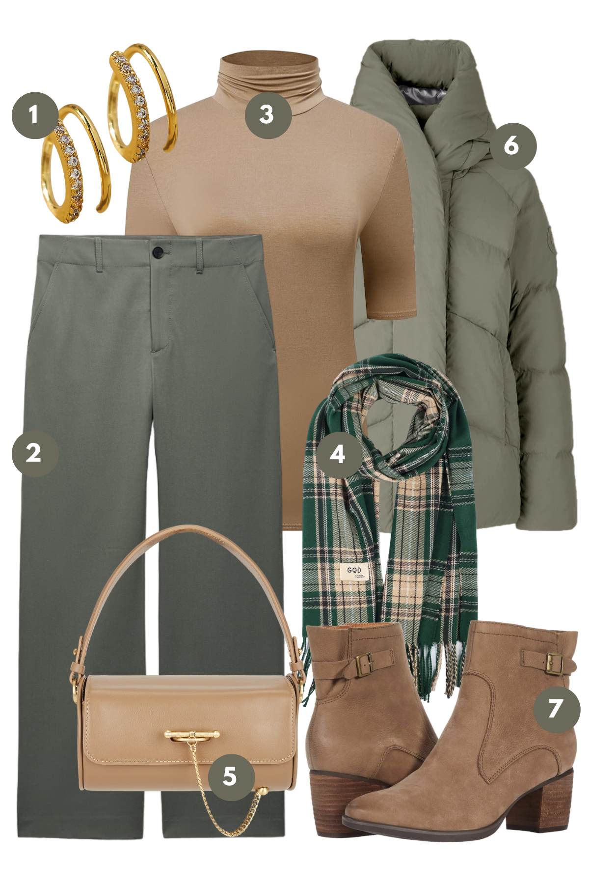 This fashion moodboard is a celebration of earthy tones and textures that come together to create a look of understated elegance. Picture yourself enveloped in the warmth of a camel turtleneck, its sleek form-fitting design offering both comfort and a flattering silhouette. Paired with tailored olive trousers, the outfit becomes a canvas for autumnal splendor. Draped over this is a cozy scarf, its plaid pattern a nod to the timeless fall aesthetic, adding a layer of visual interest and warmth. For those brisk walks through changing leaves, a padded olive jacket provides the perfect outer layer.