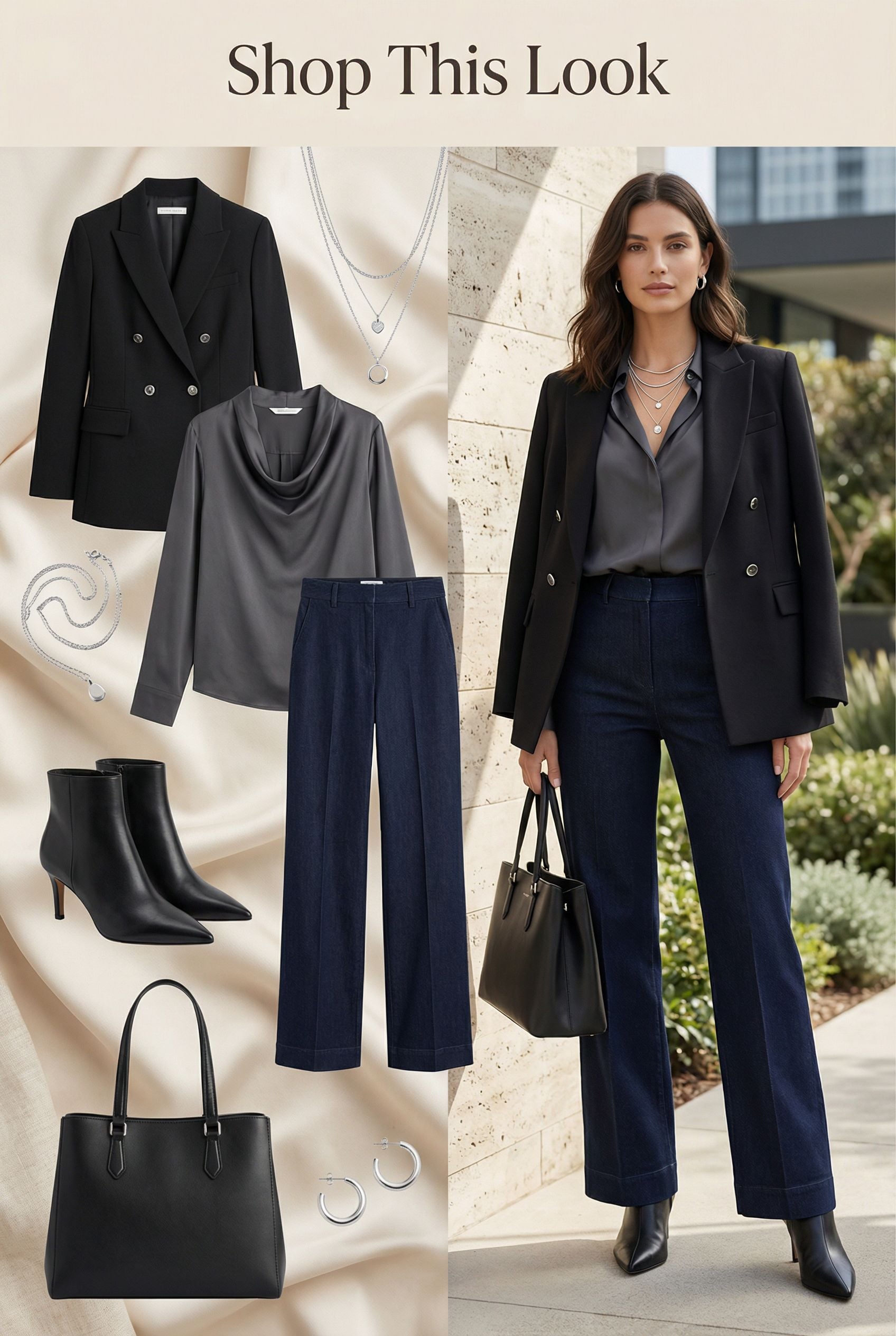 - Luxe silk blouse, dark wash straight leg jeans, and unstructured blazer