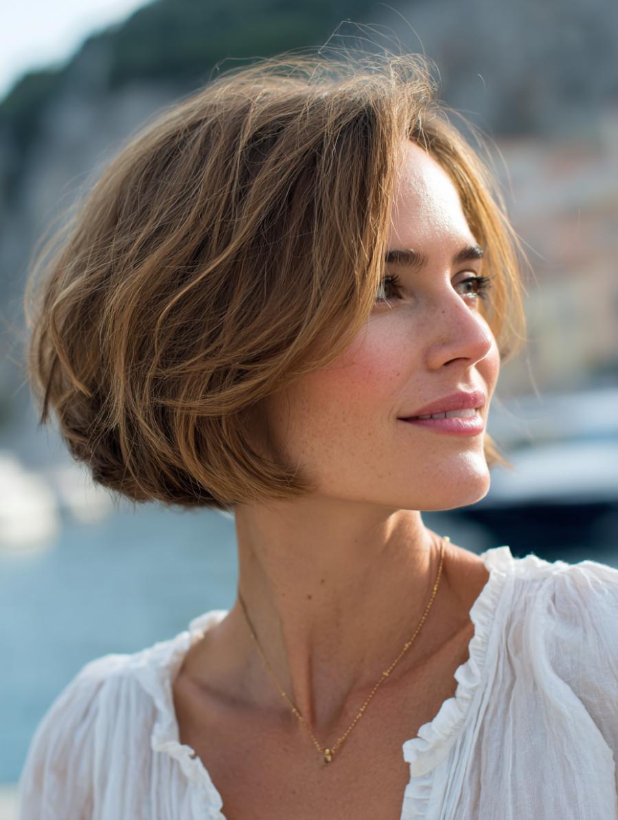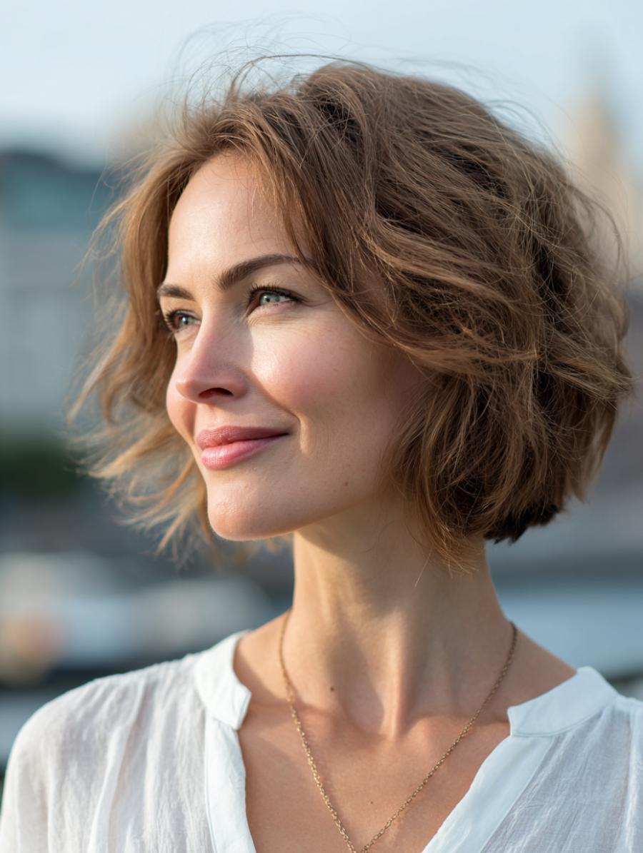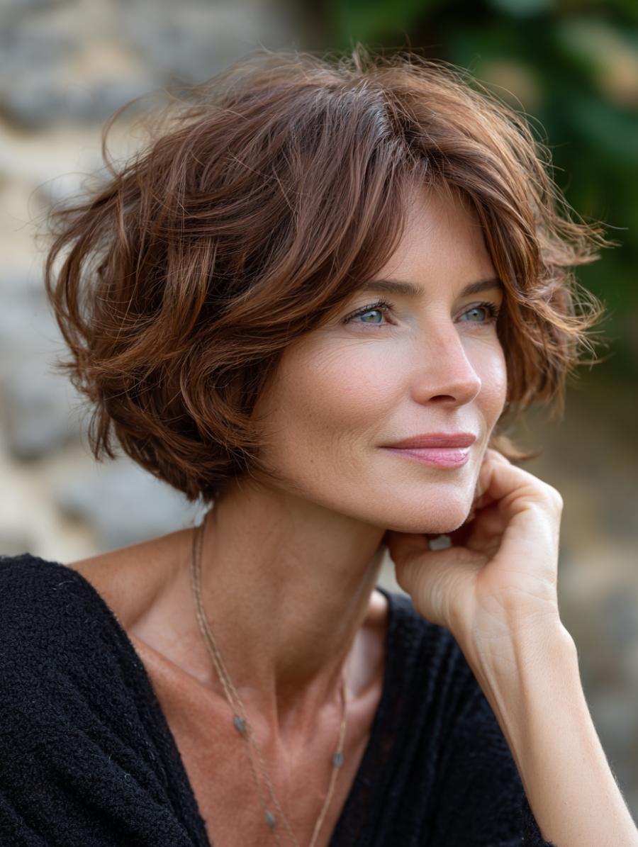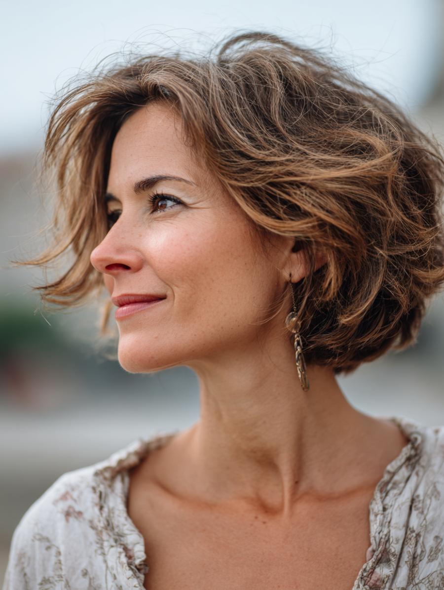 Windswept layers create natural movement in this chin-length cut that requires minimal styling effort. Side-swept bangs soften facial features while adding a youthful touch that flatters mature women. Simply scrunch with texturizing cream and air-dry for instant sophistication.