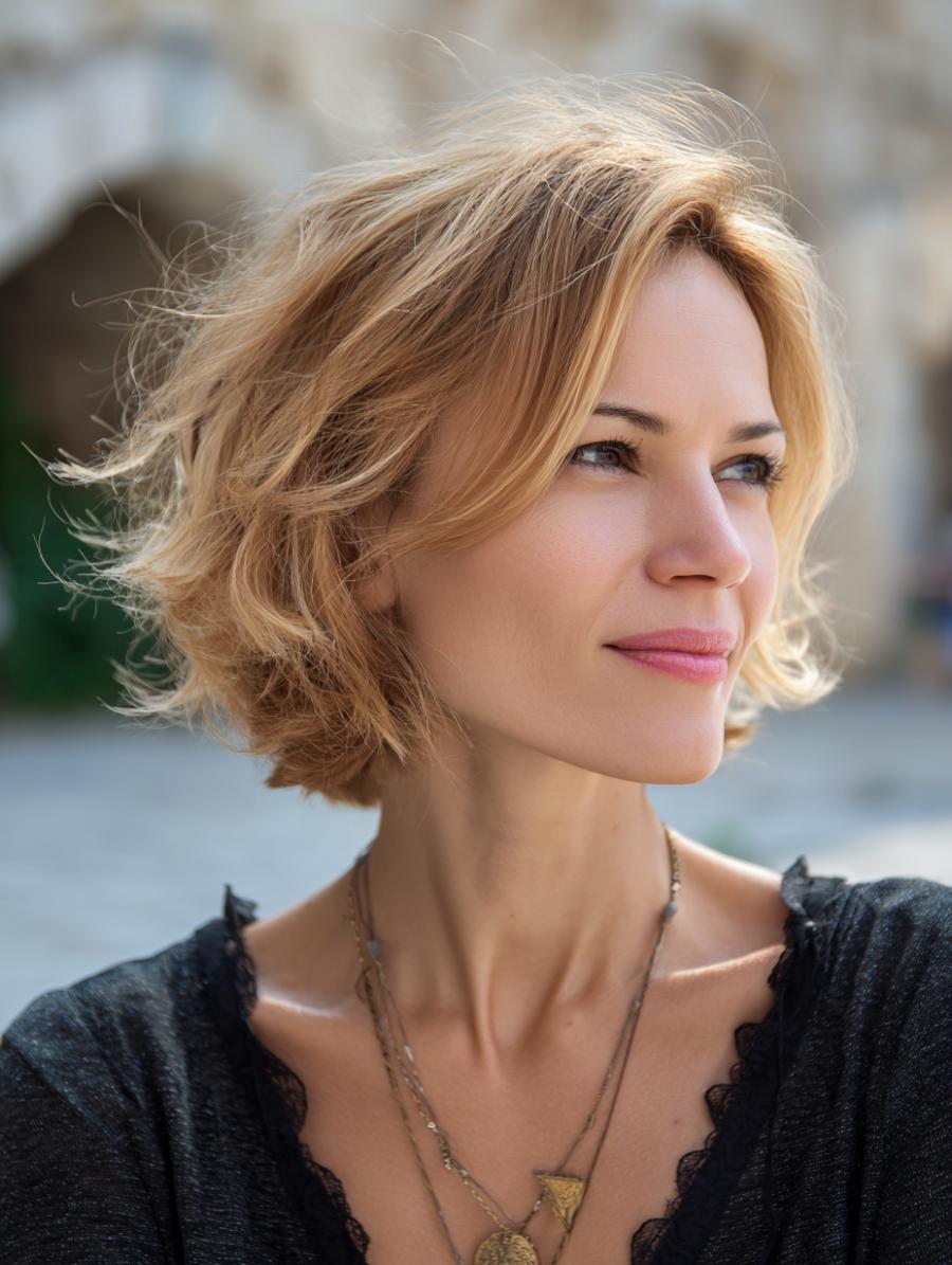 Golden highlights dance through this tousled bob, creating natural dimension that flatters every angle. Wind-caught layers add texture and movement while requiring minimal styling effort each morning.