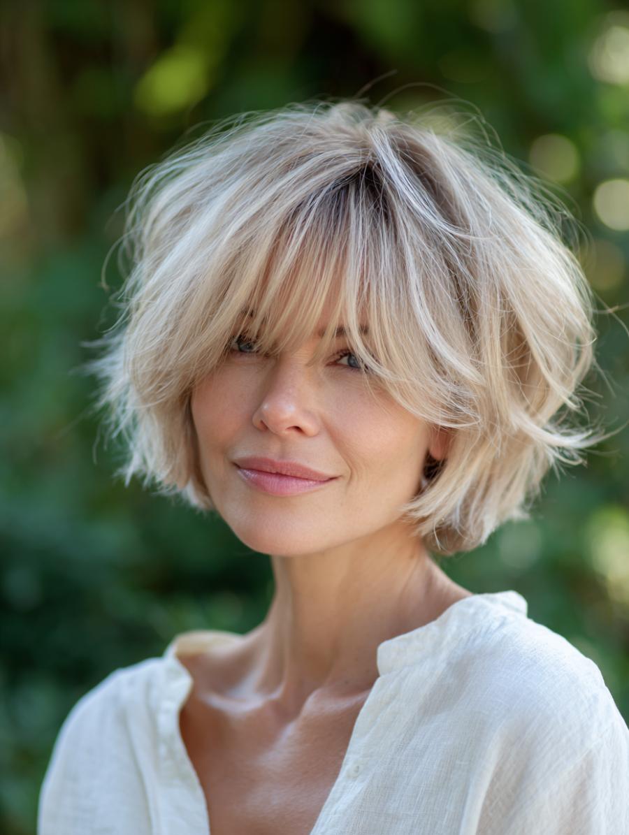 Windswept blonde layers fall naturally around the face, creating texture without requiring daily styling effort. Side-swept bangs soften angular features while the choppy ends add youthful bounce that works beautifully for busy mornings.
