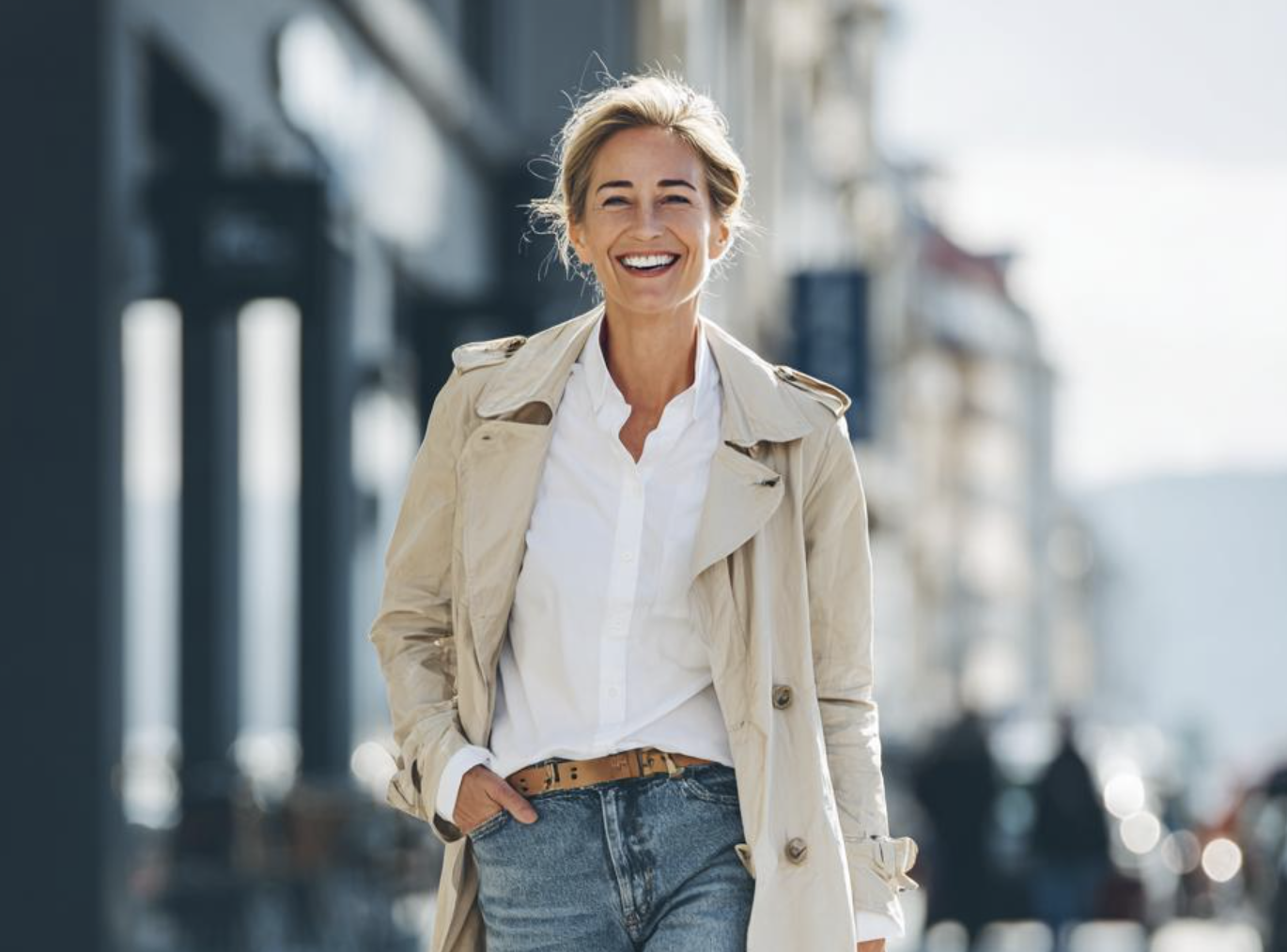There’s something undeniably sophisticated about a woman who masters the art of effortless dressing, and this look perfectly captures that essence. The classic trench coat layered over crisp basics proves that age brings wisdom in wardrobe choices – knowing that investment pieces and timeless silhouettes will always serve you well. This ensemble demonstrates how confidence is the best accessory, and how a genuine smile can elevate even the simplest outfit. The relaxed yet polished styling shows that looking put-together doesn’t require sacrificing comfort or authenticity.