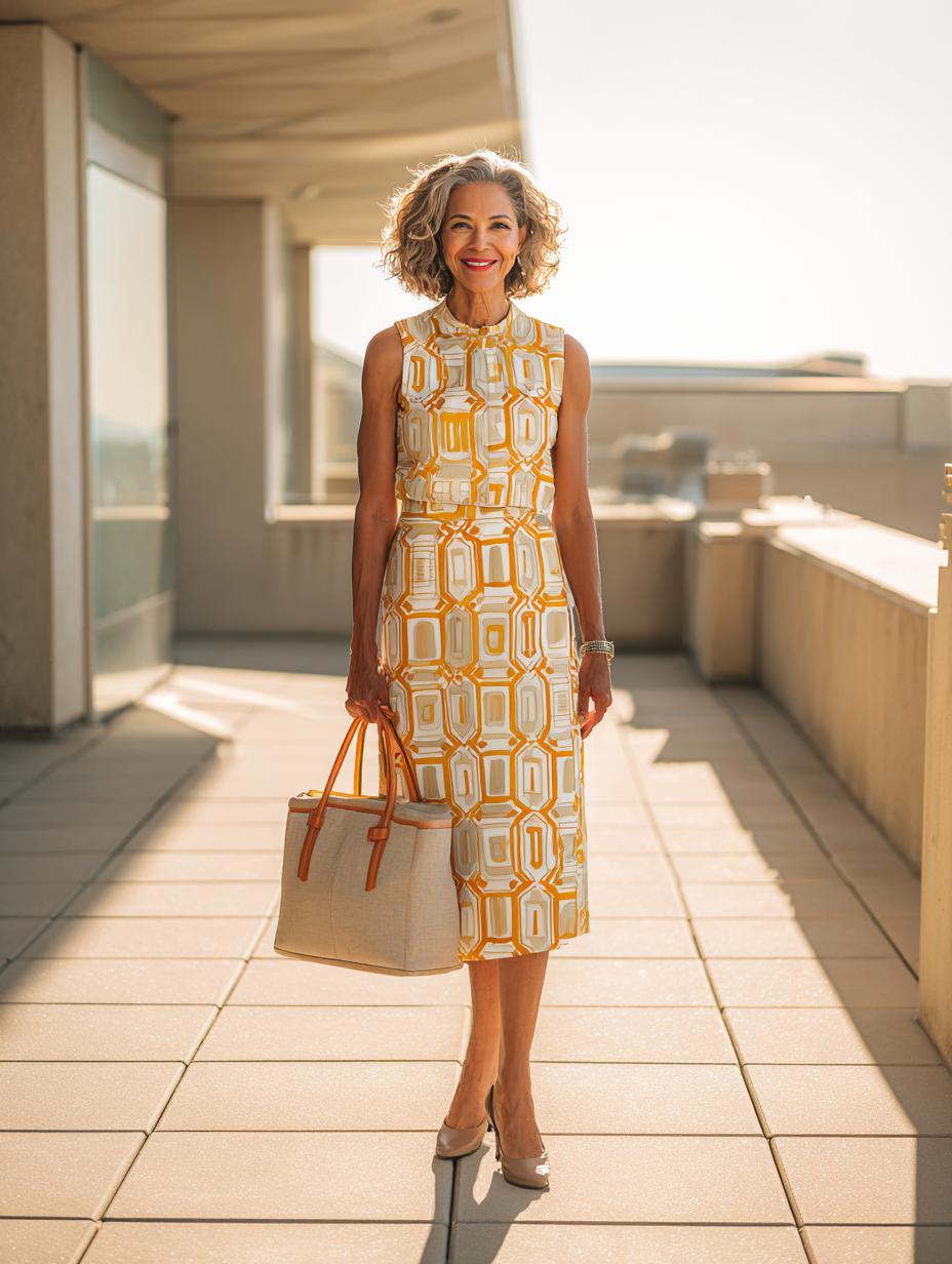 This stunning geometric print midi dress proves that bold patterns are absolutely perfect for women over 40! The key to wearing eye-catching prints is choosing sophisticated silhouettes that flatter your figure. This sleeveless midi length creates an elegant, polished look that’s perfect for business meetings, lunch dates, or special occasions. The geometric pattern in warm golden tones adds visual interest while remaining refined and age-appropriate. Complete the look with neutral accessories and classic pumps to let the dress be the star of your outfit.