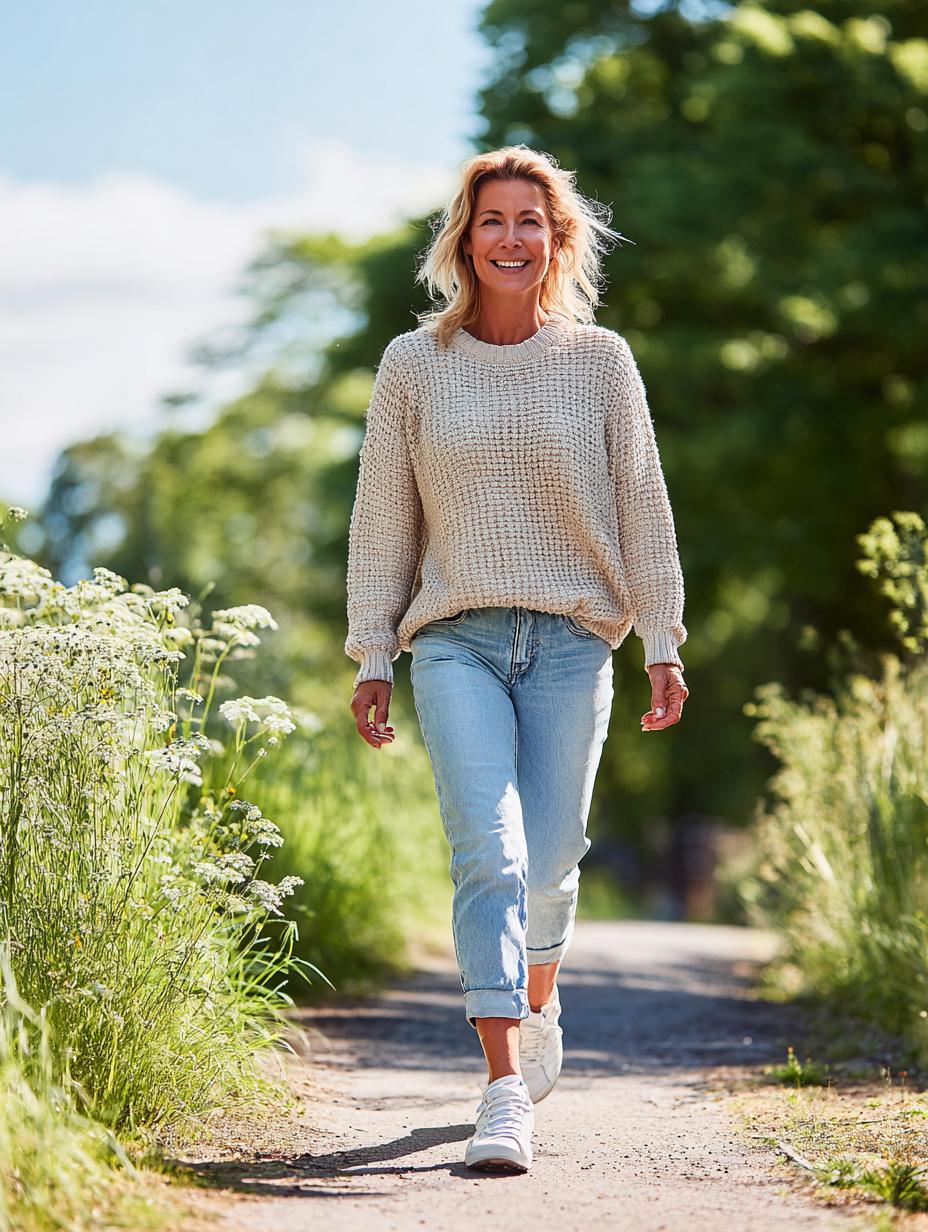 This radiant woman proves that style after 40 is all about comfortable confidence. Her relaxed yet polished ensemble combines timeless denim with cozy knitwear for an effortlessly chic country walk look. The key to nailing this aesthetic is choosing well-fitted basics in neutral tones that flatter your figure while allowing you to move freely. This outfit strikes the perfect balance between comfort and style – ideal for weekend farmers market trips, casual lunch dates, or leisurely neighborhood strolls. The natural outdoor setting enhances the organic, lived-in appeal of this classic combination.