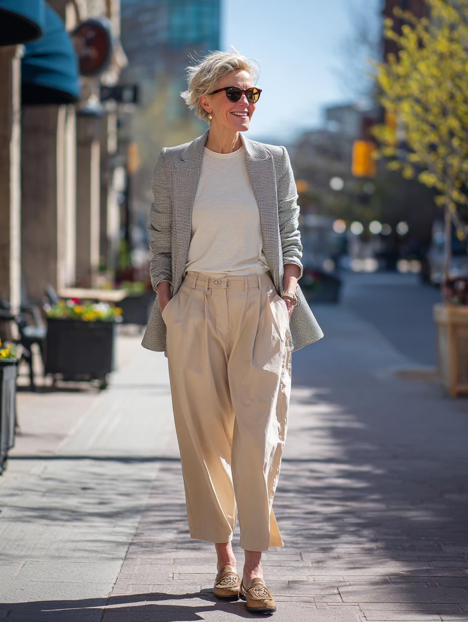 This stunning look proves that style over 40 is all about refined comfort and timeless elegance. Our radiant model showcases the perfect balance of polished and relaxed with a beautifully structured blazer paired with casual bottoms. The neutral color palette creates a sophisticated foundation that’s both versatile and flattering. Her confident stride through the blooming park setting embodies the joy and self-assurance that comes with embracing your personal style. This ensemble is ideal for weekend brunches, casual business meetings, or leisurely city exploration – proving that looking put-together doesn’t require sacrificing comfort.