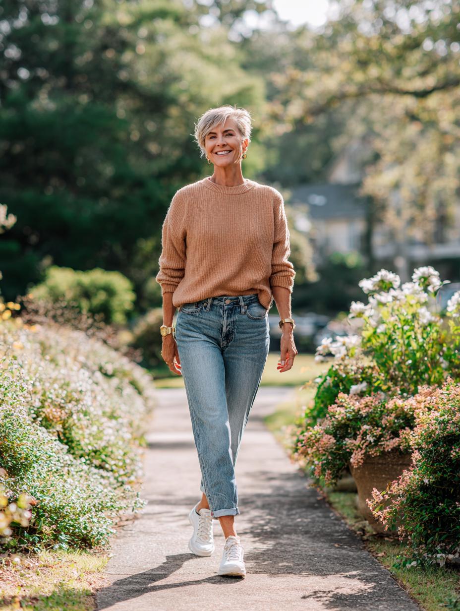 Effortlessly Chic: Camel Sweater and Jeans Combo That’s Anything But Frumpy
